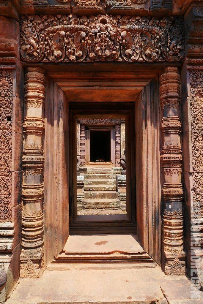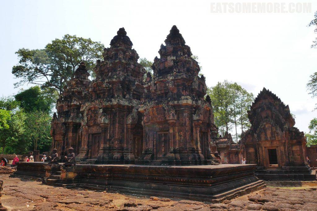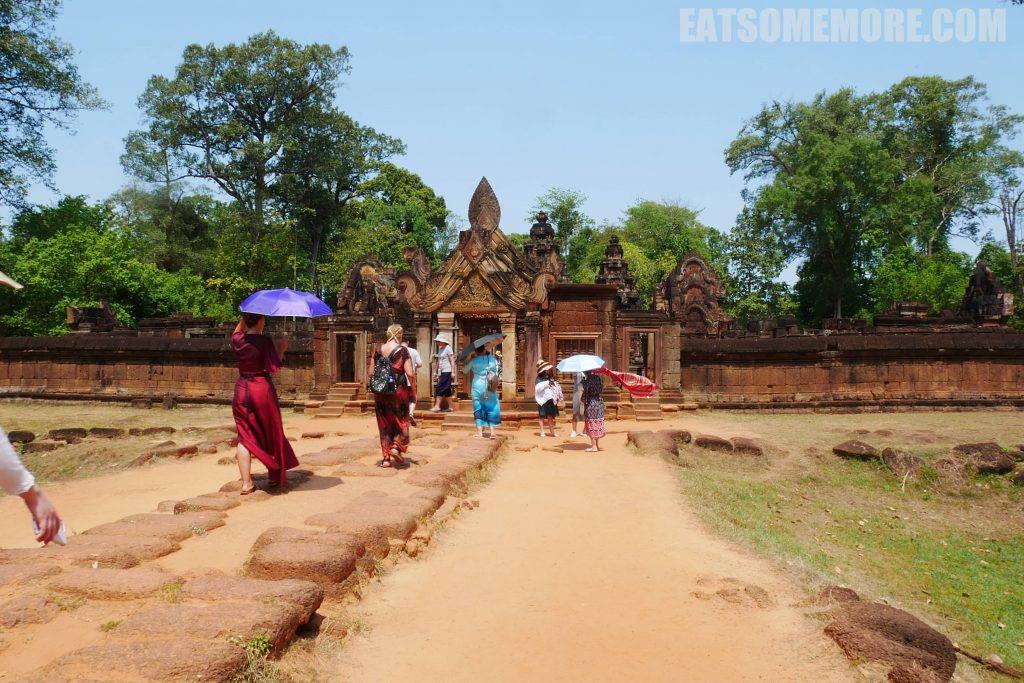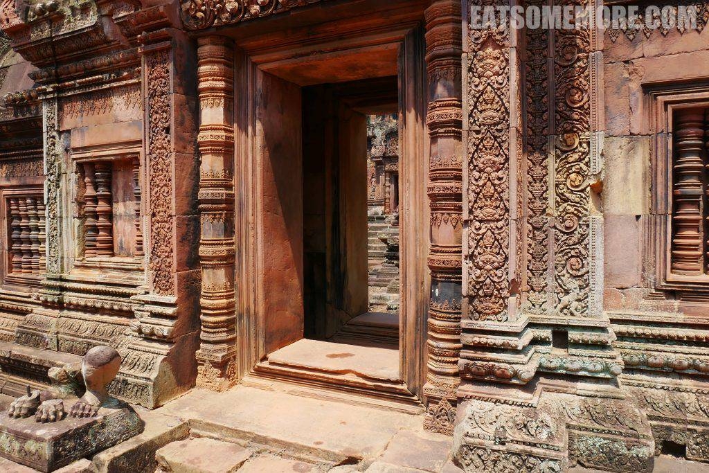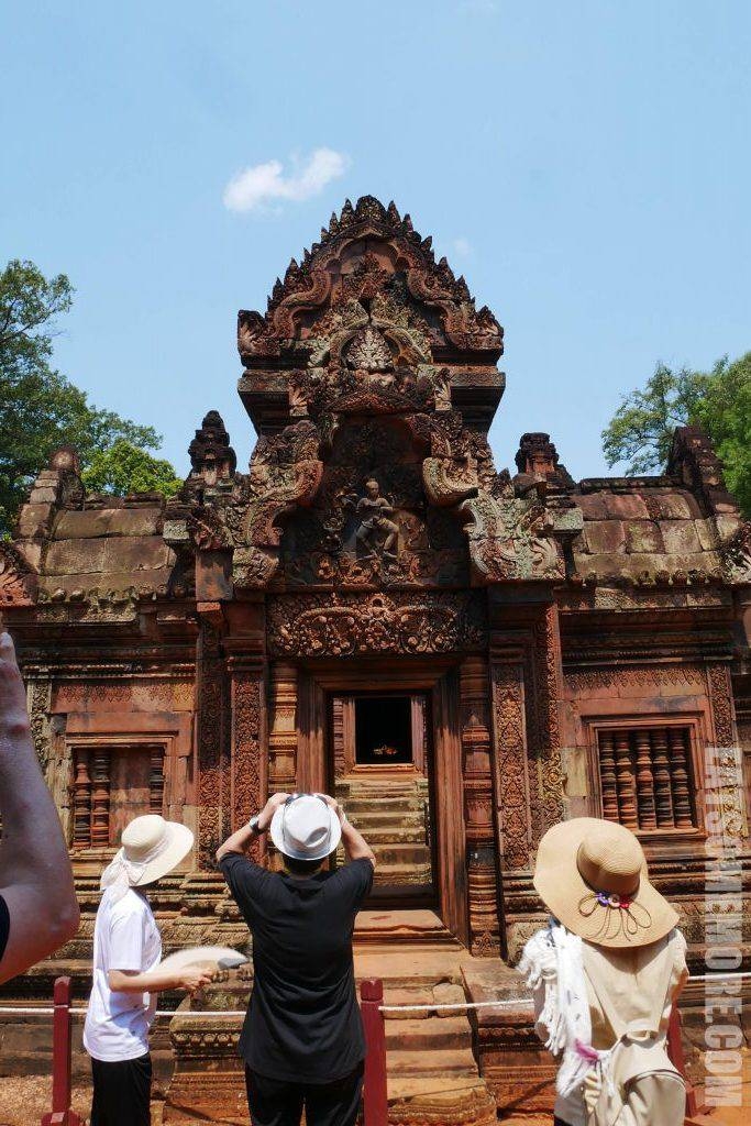 女王宫始建于公元十世纪,大规模地使用了红色砂岩,建筑上满是精致的浮雕,被誉为“吴哥艺术宝石”。