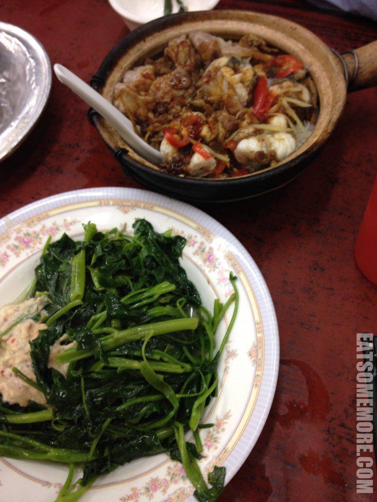 再走一走就到达了香港越夜越热闹的庙街,慕名而尝了传说中的四季煲仔饭。我们点了白鳝排骨煲仔饭。因为早有听闻香港餐饮当中一菜难求,所以特地另点了腐乳通菜一碟。煲仔饭焦香四溢,但白鳝和排骨并没有特别的出彩。