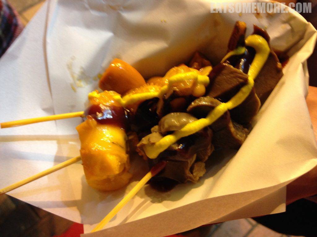 我们要了招牌三件套,包括墨鱼、鸡胗和猪肠。都是凉的,非常有弹性,口味上是甜鲜的味道。