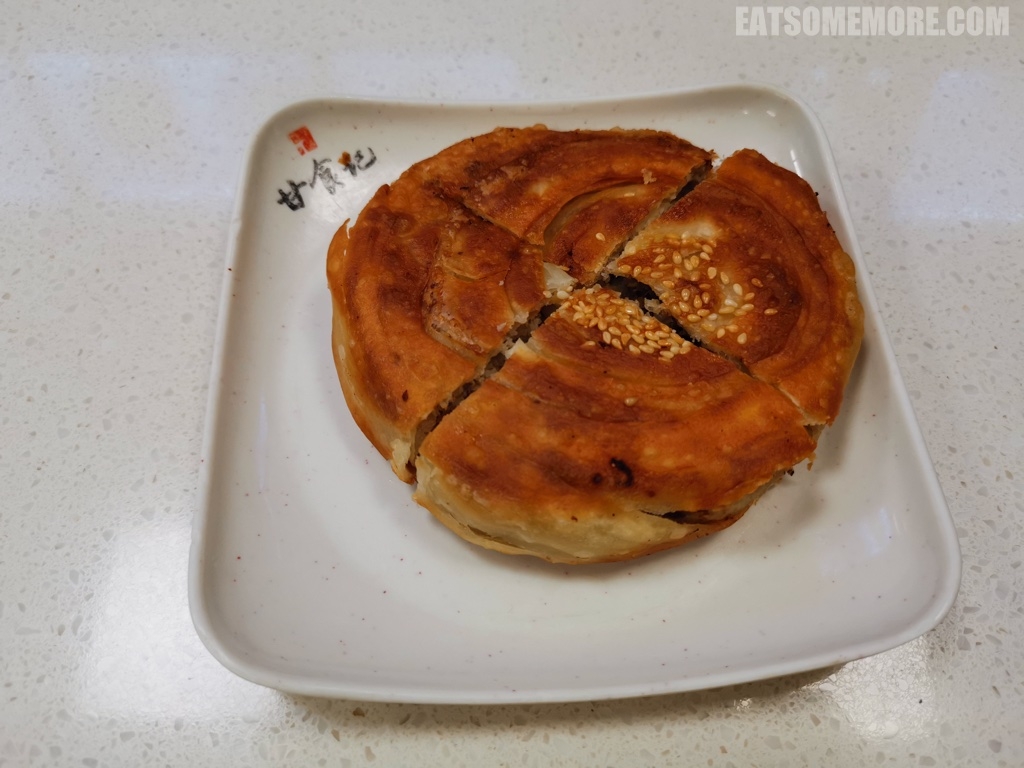 甘食记的军屯锅盔,酥皮层次更多,口感更酥脆,油香更盛,花椒的麻更凸显出牛肉馅的鲜,再沾一下肥肠粉的汤汁,更添鲜香爽麻。