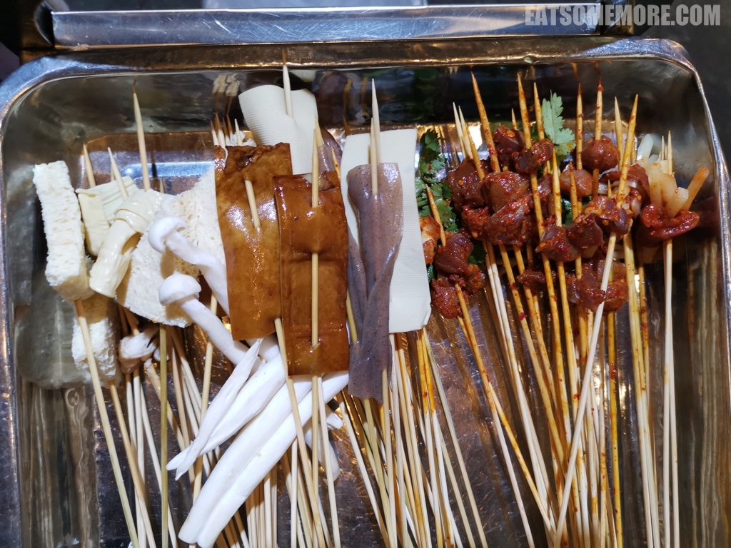 串在串上的食材摆放在冷柜当中。我们选取了一些小郡肝、香菜牛肉、折耳根牛肉、鱿鱼、豆腐皮、冻豆腐和腐皮卷,有些平平无奇。
