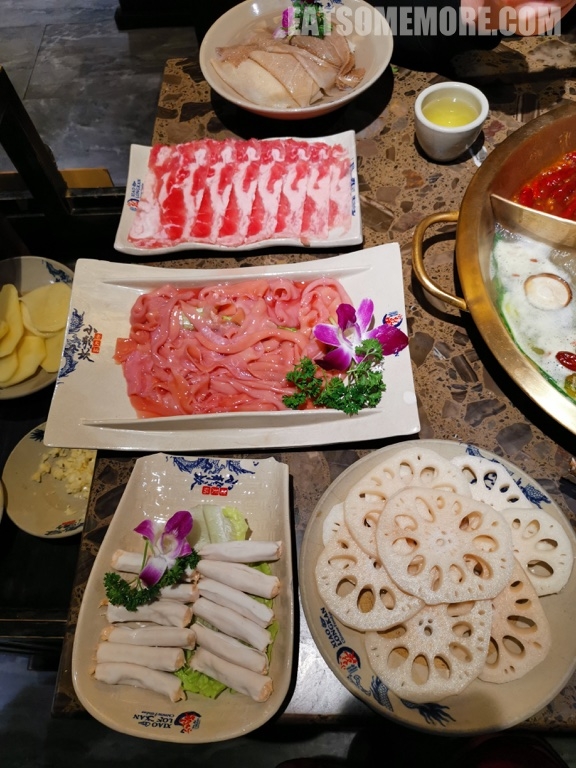 火锅必备食材牛百叶、嫩牛肉、鸭肠、鱼肉燕饺、藕片等等都来上一份。我最喜欢的是厚薄适中、鲜嫩甘香的牛肉片,在红油当中涮过一涮,更添香辣麻爽。