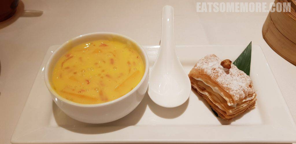 杨枝甘露和核桃仁拿破仑进行了中西合璧的组合。拿破仑薄脆的酥皮夹着鲜甜的奶油,诠释着甜品的美妙真谛;而另一边,果汁的浓郁、芒果的香糯和柚子的酸甜,伴随着点点西米全都开了挂地滑进了我的肚皮里,得再来一碗才能继续进行美食的学术性探讨啦。