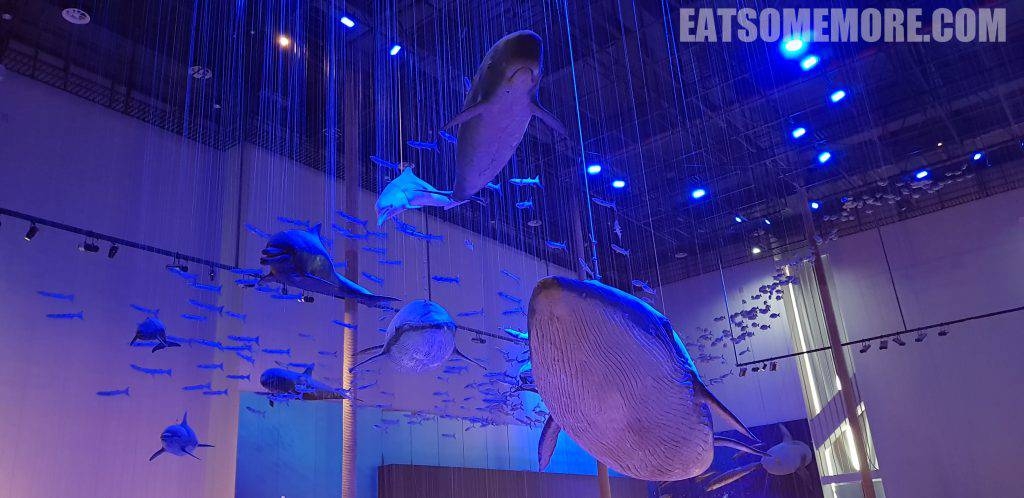 值得一提的是馆内有一组鲸鲨装饰,营造了一个浮在空中的海洋世界。
