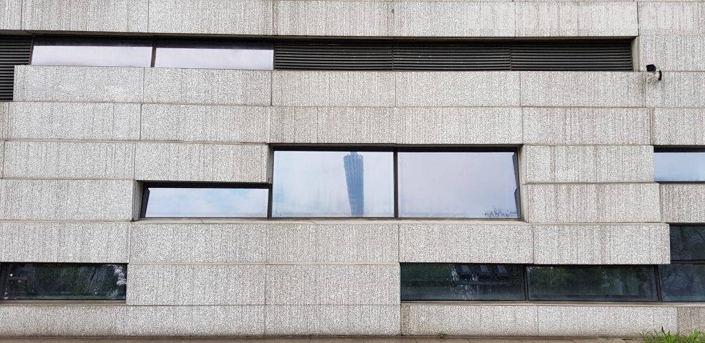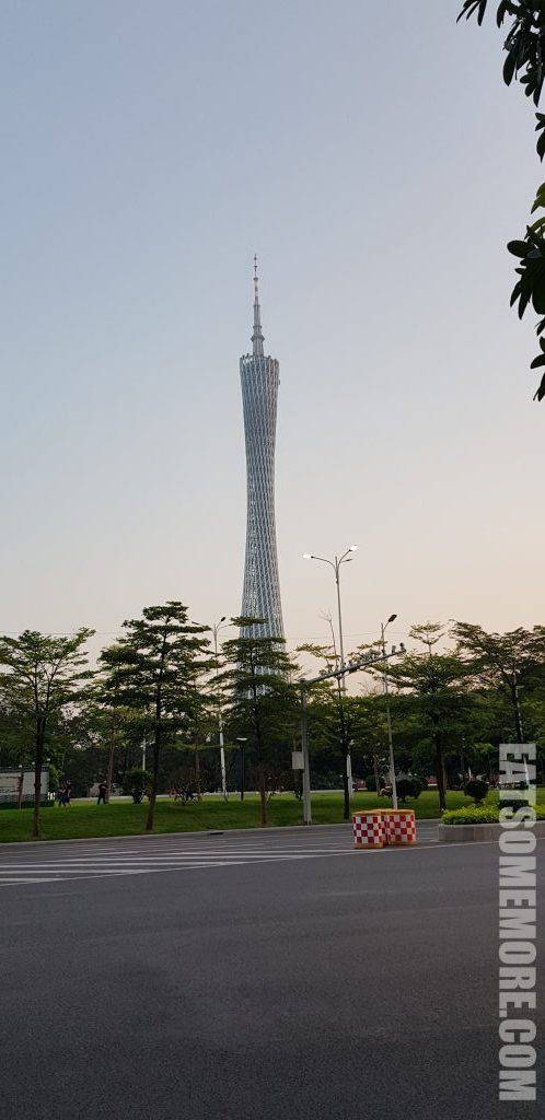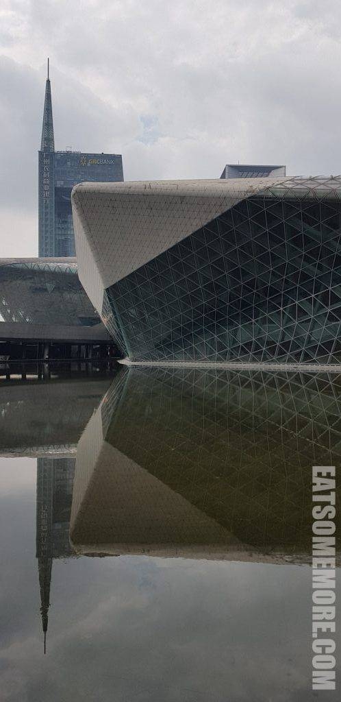博物馆东门的街对面是另一家米其林一星餐厅炳胜品味。这个角度的广州塔看起来有些时髦。