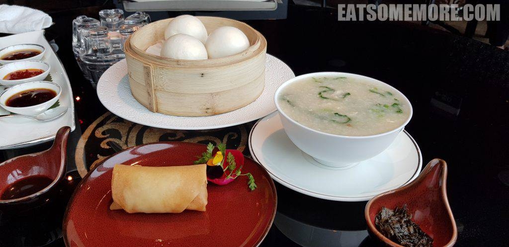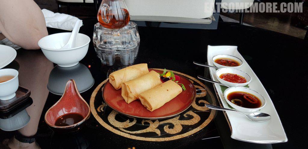 鲜虾春卷三根搭配蘸料三碟,分别有鱼露、辣酱和酱油。