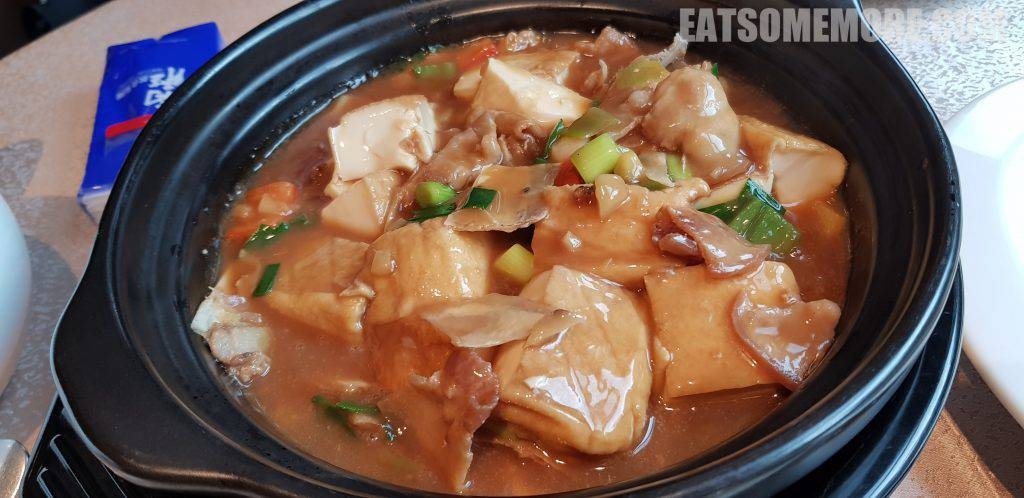 乡下猪肉鱼头焖水鬼重的本质是油炸豆腐煲。集山泉、黄豆和蛋清于一体的山水豆腐,下花生油炸得金黄,再浸在水里保持水分,因此得名“水鬼重”,炖煮在猪肉和鱼头作用下浓稠的汤汁里,鲜香不输豚彘,嫩滑远胜鱼头。又是吃美的一天。