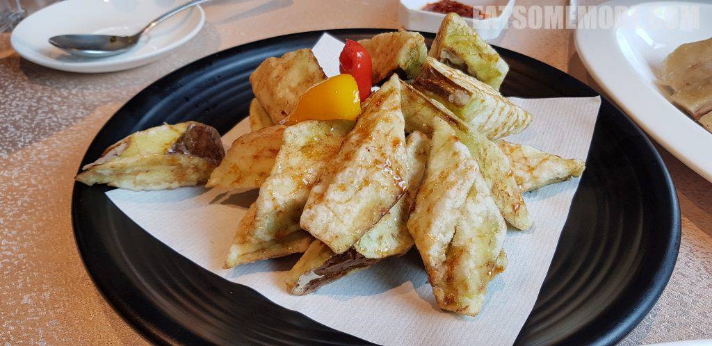 招积冰川茄,做法神似天妇罗,却淋着糖浆。香脆的表皮包裹着软绵多汁的茄子。