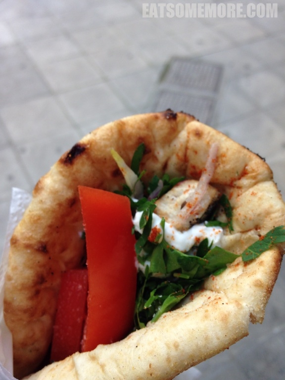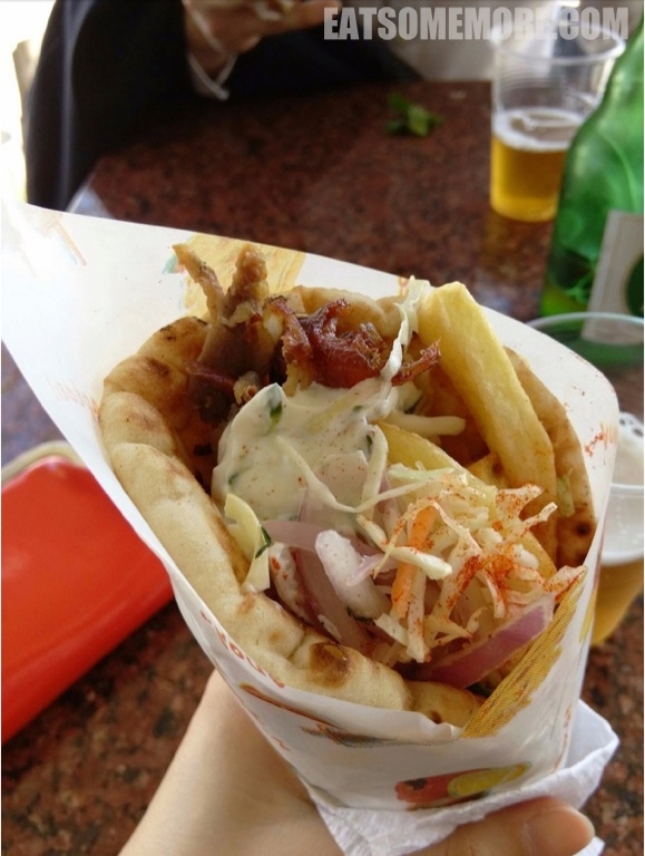 走着走着看见一家有人在排队的卷饼店,心想一定是好吃的才有人排队吧。于是就有了我来到希腊后的第一个卷饼(pita)。有鸡肉串(souvlaki)、芝士、西红柿、洋葱和青菜。其实味道比较单一,饼皮本身也有点也有点太面了。有趣的是店老板的找零机制,基本是靠顾客自助的。如果遇见像我这样不熟的顾客,老板会用小镊子将找的硬币纸币夹给顾客。看起来食品卫生真是棒得不得了。另外,老板的收银台上放了好多一寸照,问了老板以后才知道那些都是朋友和客户留的。好有爱。