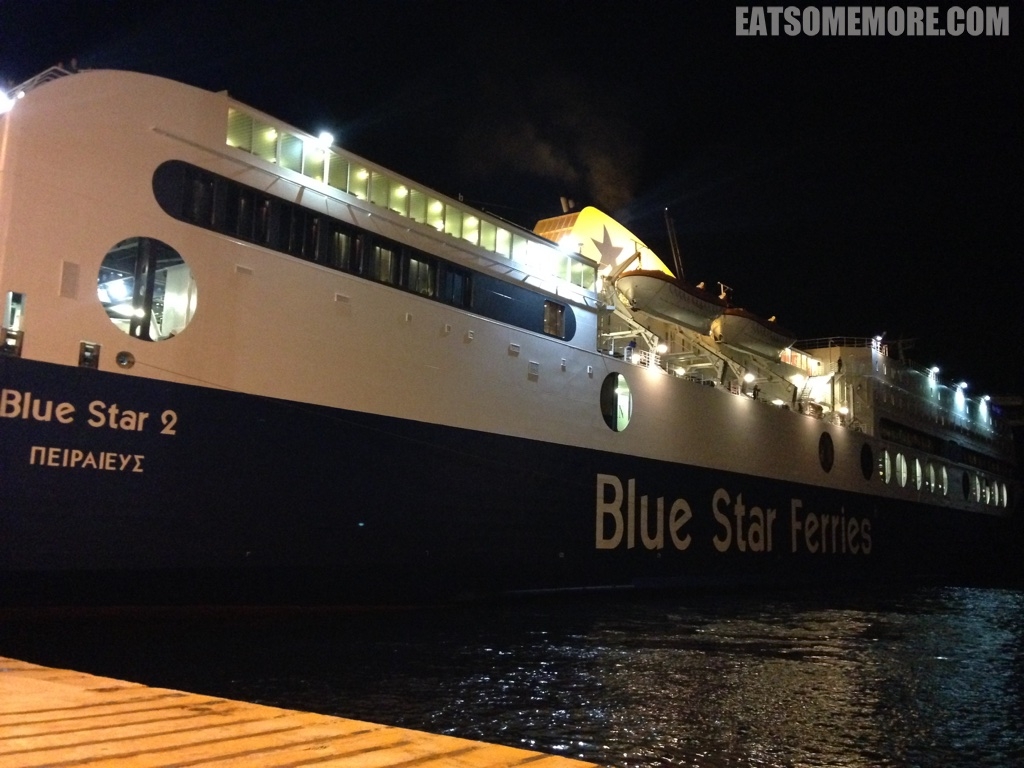 到了Piraeus站后,网上预定船票的需要先在蓝星专门店换船票,然后到达指定港口乘船。我们预定的是航空座位票,但是船上空间很大,大家都非常自由地坐来坐去。 船上也有几个吃饭的地方,一些在落地窗前的座位,景观很棒。