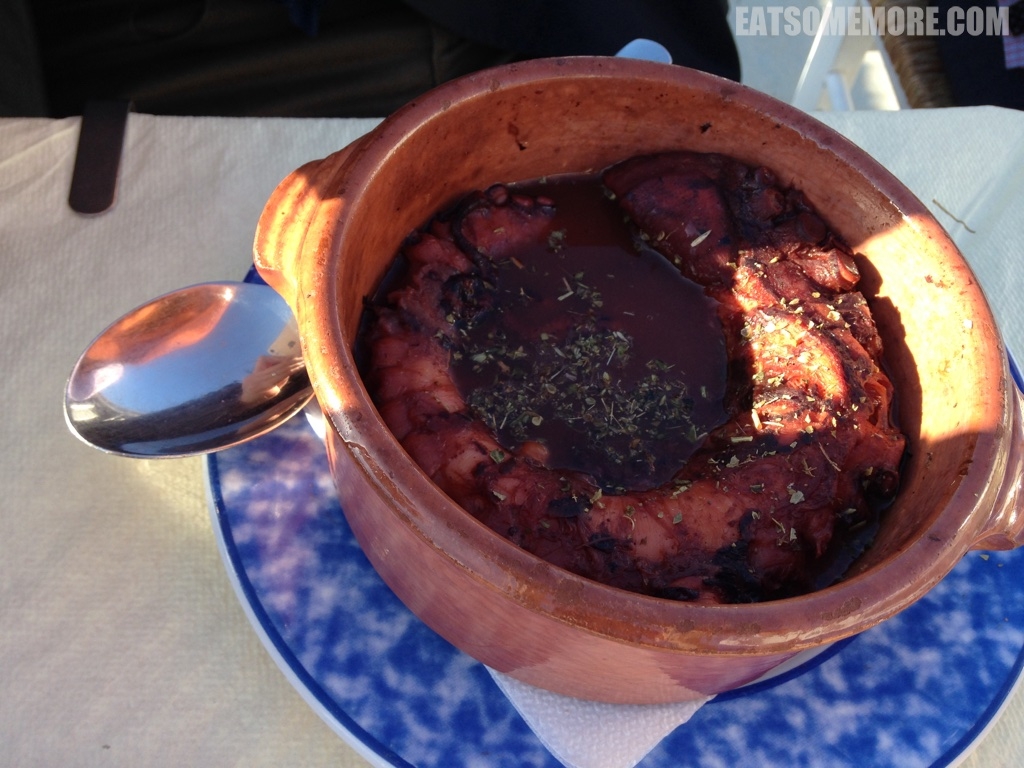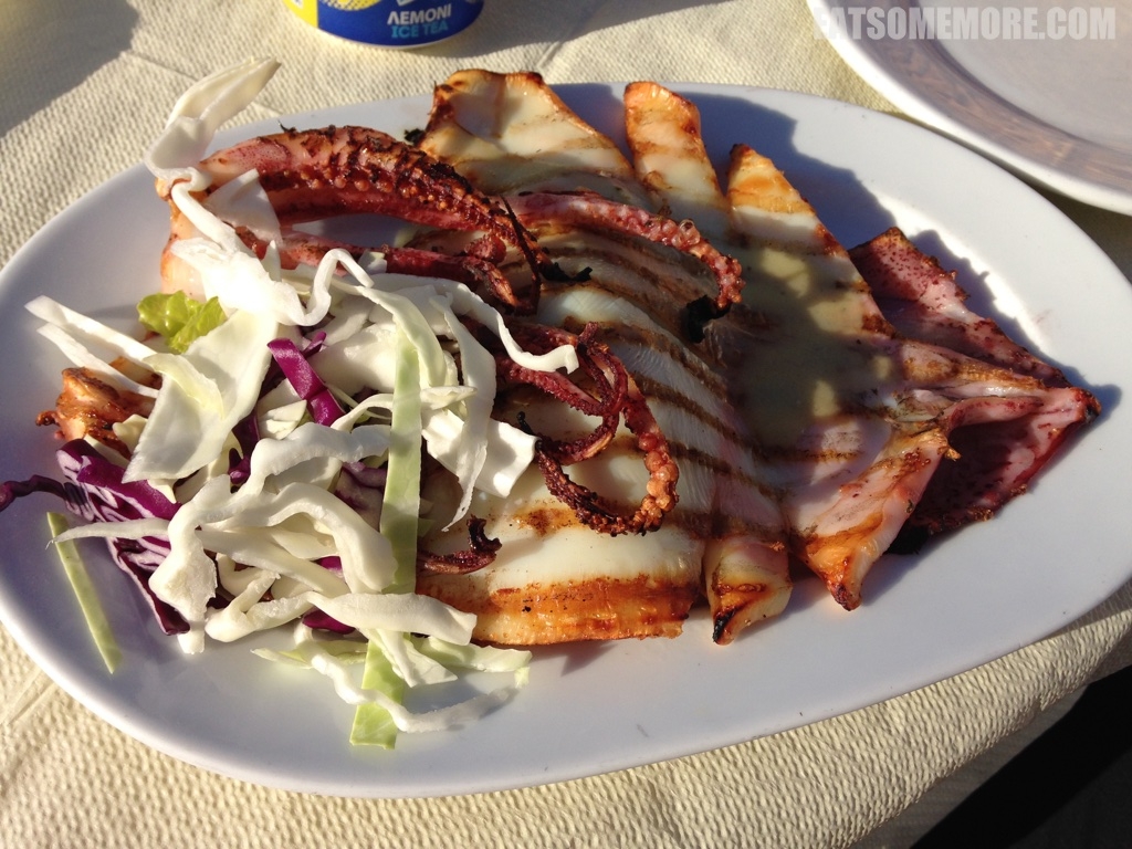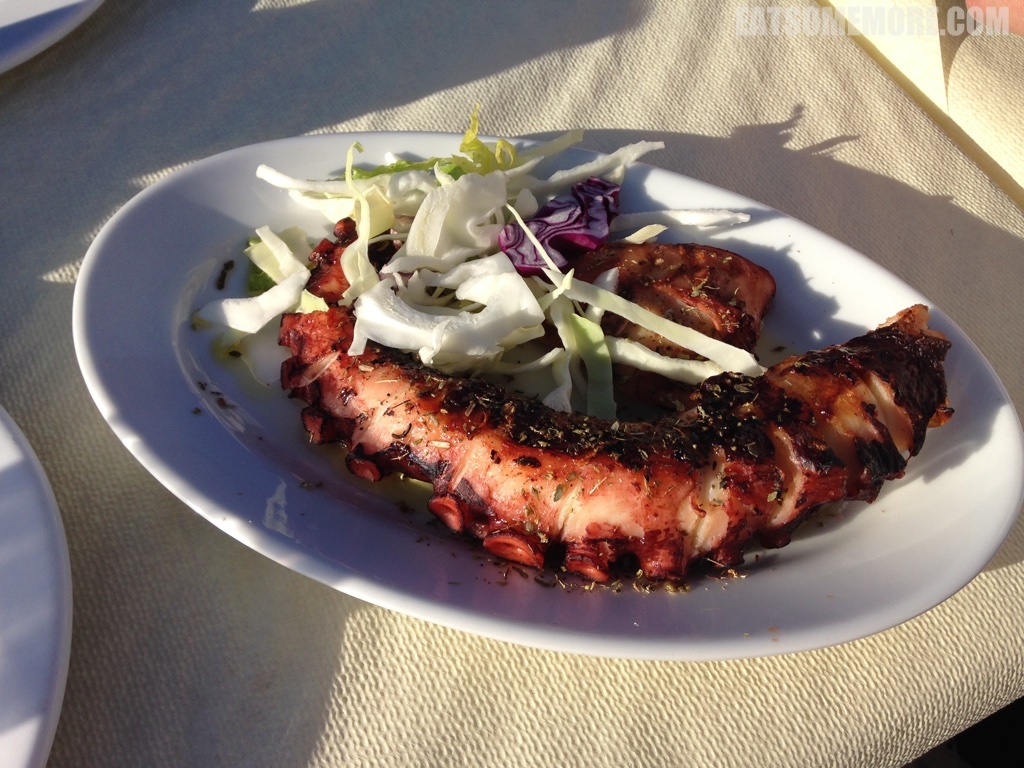 傍晚时,我们来到了人气推荐的章鱼餐厅。味道果然不错。 伊亚镇招牌章鱼的外皮烤得香香的,肉质又鲜又嫩又有弹性。
