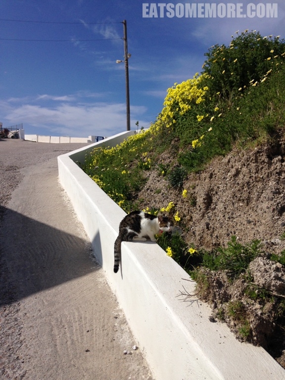 早上的圣托里尼有着地中海地区的本色慵懒:狗狗还在街上睡觉、猫咪在发呆、大多商店还没有开门、行人稀疏、从酒店退了房的游客自己背着大行李举步维艰。