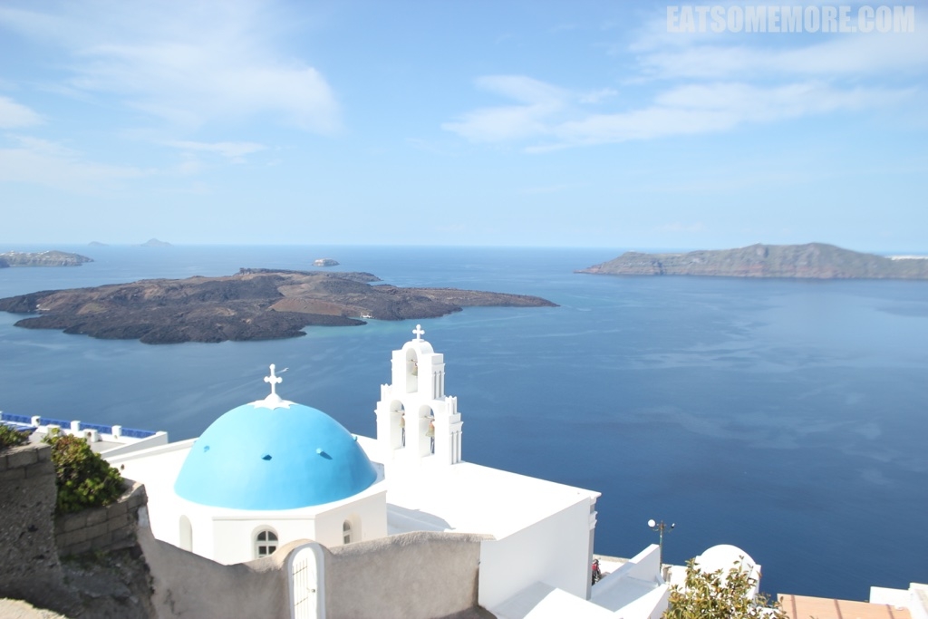 走不多久,就到达了因为国家地理杂志封面红遍大江南北的蓝顶教堂。菲拉斯特凡尼这个面向爱琴海的教堂的本意初衷如何我不得而知。到如今这样的游人如织,它还是静静地矗立在那里,望着爱琴海,不知道它到底是开心还是不开心。