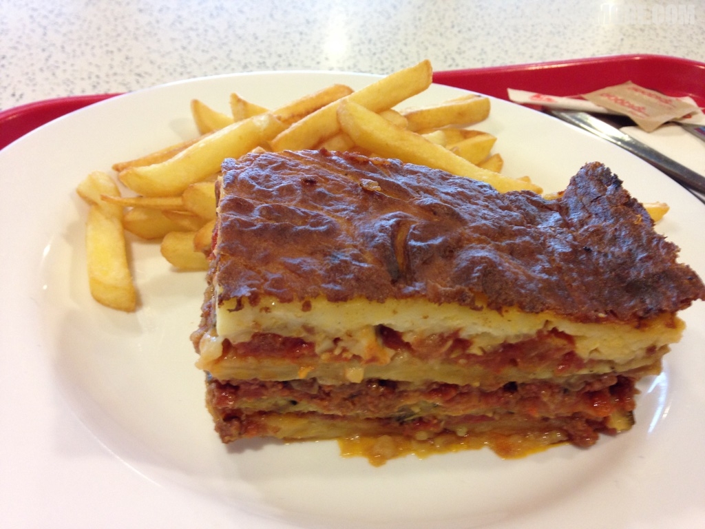 晚餐尝试了希腊名产moussaka, 有点像Lasagne,但是是一层土豆一层肉酱,肉酱里还有一些蔬菜,例如番茄和茄子。个人觉得比lasagne好吃。
