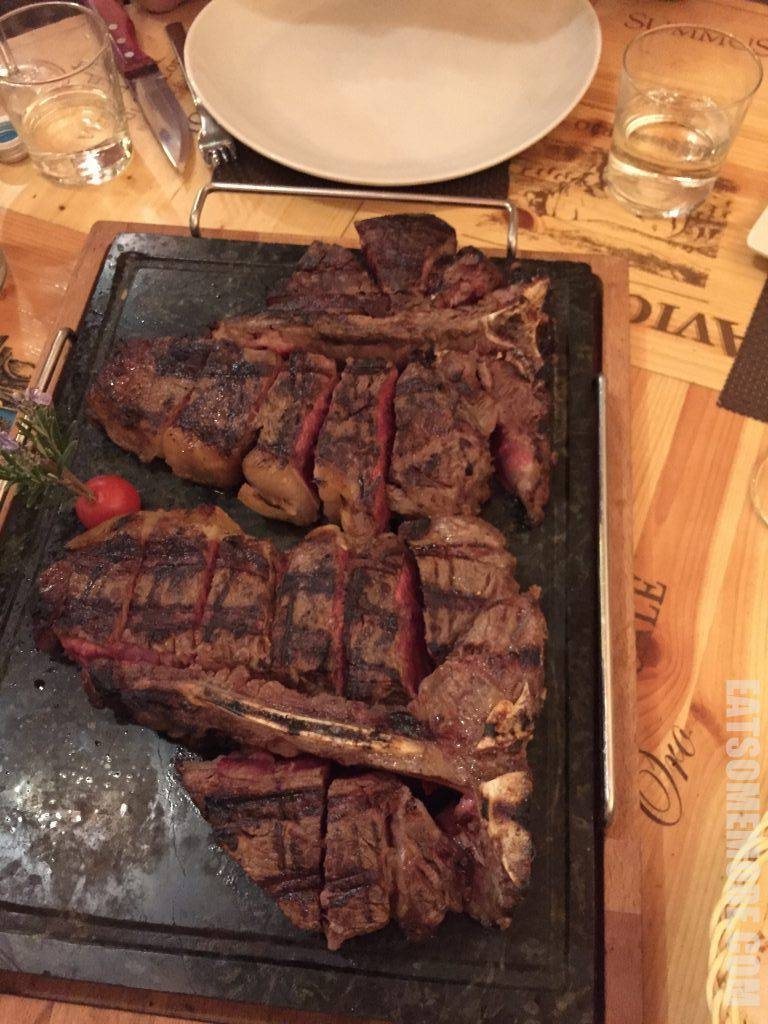 晚餐来到了佛罗伦萨数一数二的牛排馆 Trattoria dall'Oste。招牌菜T骨牛排选用的是意大利Chianineria地区的牛,骨头的一边是牛里脊,另一边则是沙朗。