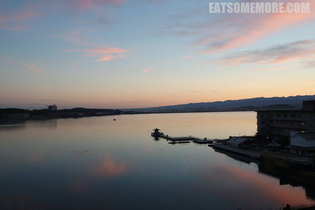 旅馆的室外温泉面对着柴山瀉湖。清晨的湖面平静得像镜子似的,倒映着天空的朝霞。温泉热气袅袅,远山连绵起伏,心也不知不觉地跟着淡然了起来。