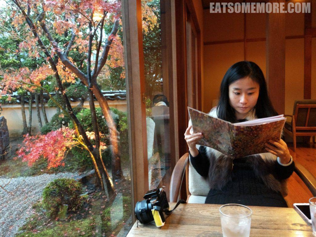 七拐八弯地来到了一间有着可爱院子的日式茶馆 Ex Cafe。进门处排着长长的队,排到后把鞋存在门口的柜里,跟着服务员走进了茶馆内部,豁然开朗。挨着落地窗坐下,窗外是白墙黑瓦红叶,秋雨轻敲枯山水。