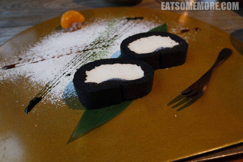招牌甜点鲜奶竹炭蛋糕,像云一样轻软,像梦一样甜蜜。蛋糕旁边还准备了解腻的橘子果肉和栗子泥。