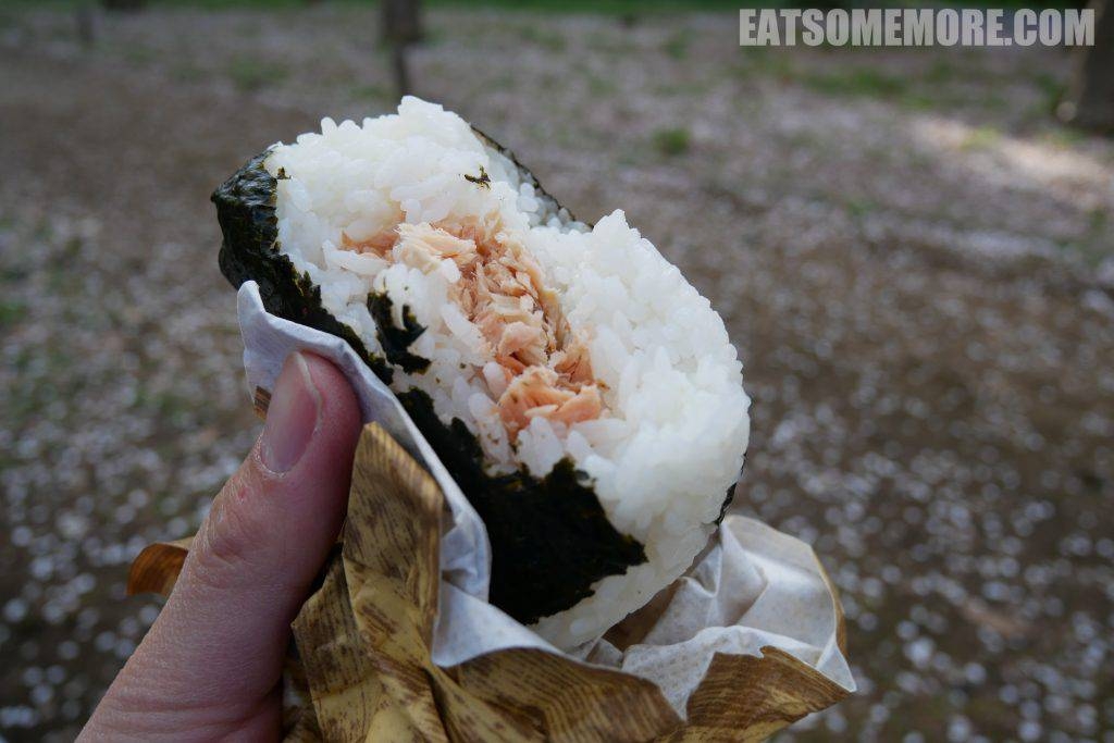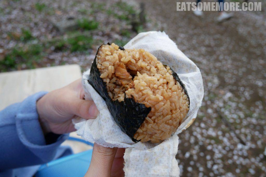 “花见”是日本自古以来流行的春季盛事,即在樱花树下赏樱飨宴作乐。到了今天,这一习俗演化成了在樱花树下野餐。入乡随俗的我们,在佐藤水产店瞎蒙着购入了两个海鲜饭团,也来凑个热闹。