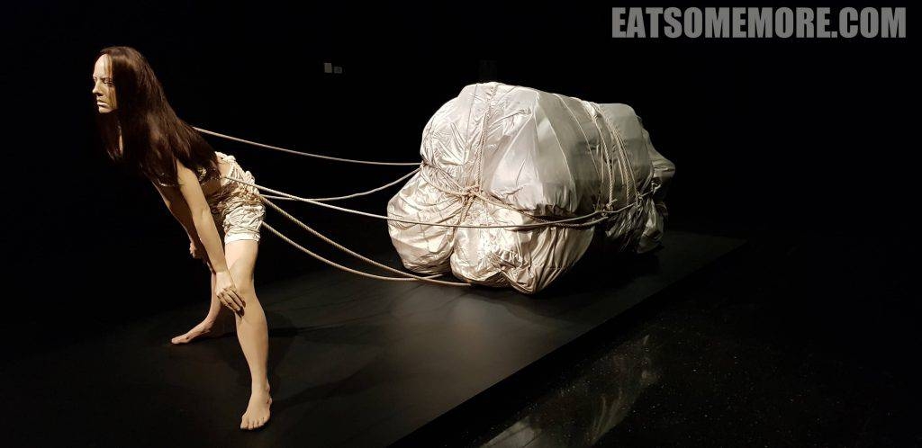 其中一个展厅的一片漆黑当中,一位模特正负重前行。