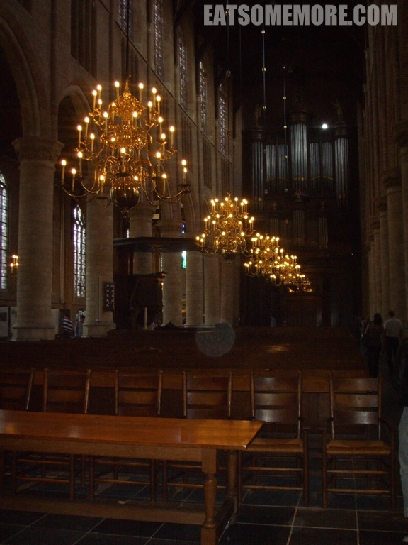 欧洲小镇的中心,总是两座教堂——一座叫旧教堂,另一座则是新教堂。我曾经询问一位在荷兰土生土长的朋友,为什么一个城镇里总有新、旧两座教堂,跟天主教和新教有什么关系吗?朋友说,在我问之前,她还真没想过这个问题。后来经查证,天主教和新教在历史上对荷兰都产生过很大的影响,但是现在宗教信仰自由已经成了宪法的一部分,目前几乎一半的荷兰人并没有宗教信仰。走进戴尔福特新教堂,我着实被里面的住客吓了一跳——请务必留意脚下——在这里的青石板下,躺着包括威廉一世在内的荷兰历代国王、女王,此外还有“国际法之父”格劳秀斯等许多名人。相比之下,教堂另一侧号称“戴尔福特第一高度”的塔楼,也黯然失色了起来。