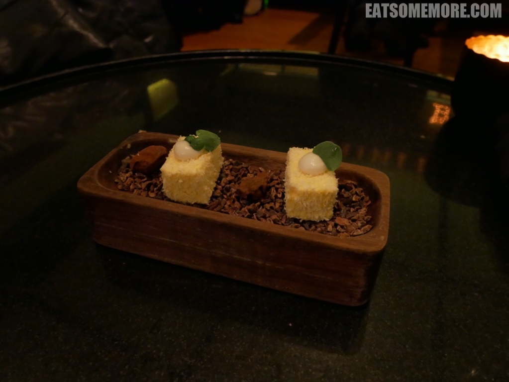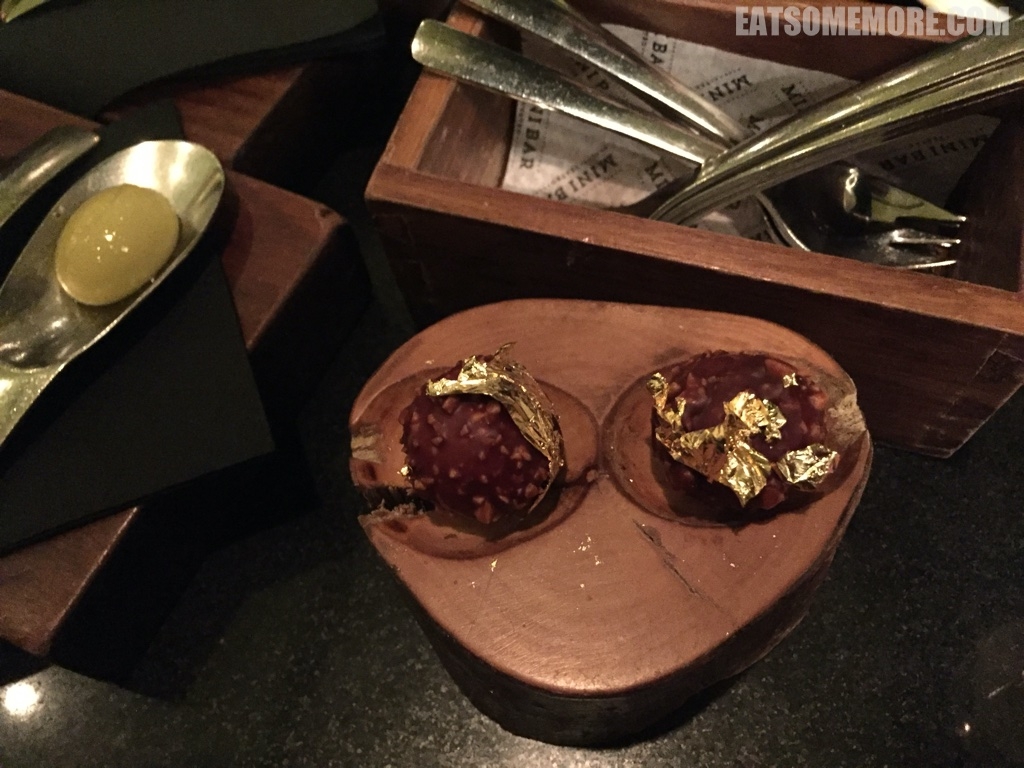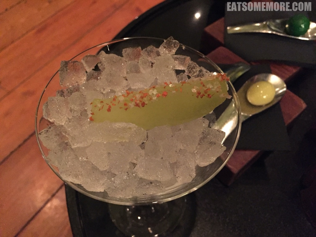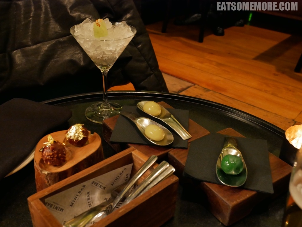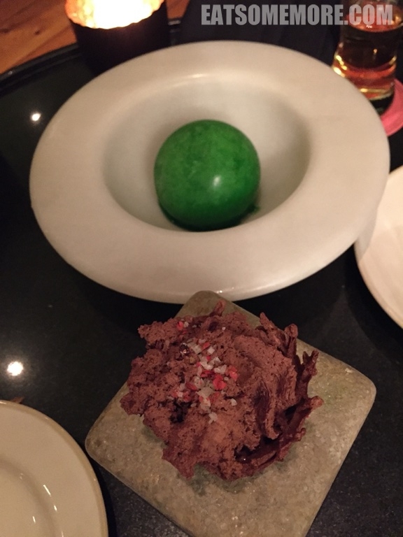 菜品精致充满创意。右手边翠绿色的珠子是莱姆味的卡琵莉亚鸡尾酒糖。中间黄绿色的两团啫喱里包裹的是橄榄汤。