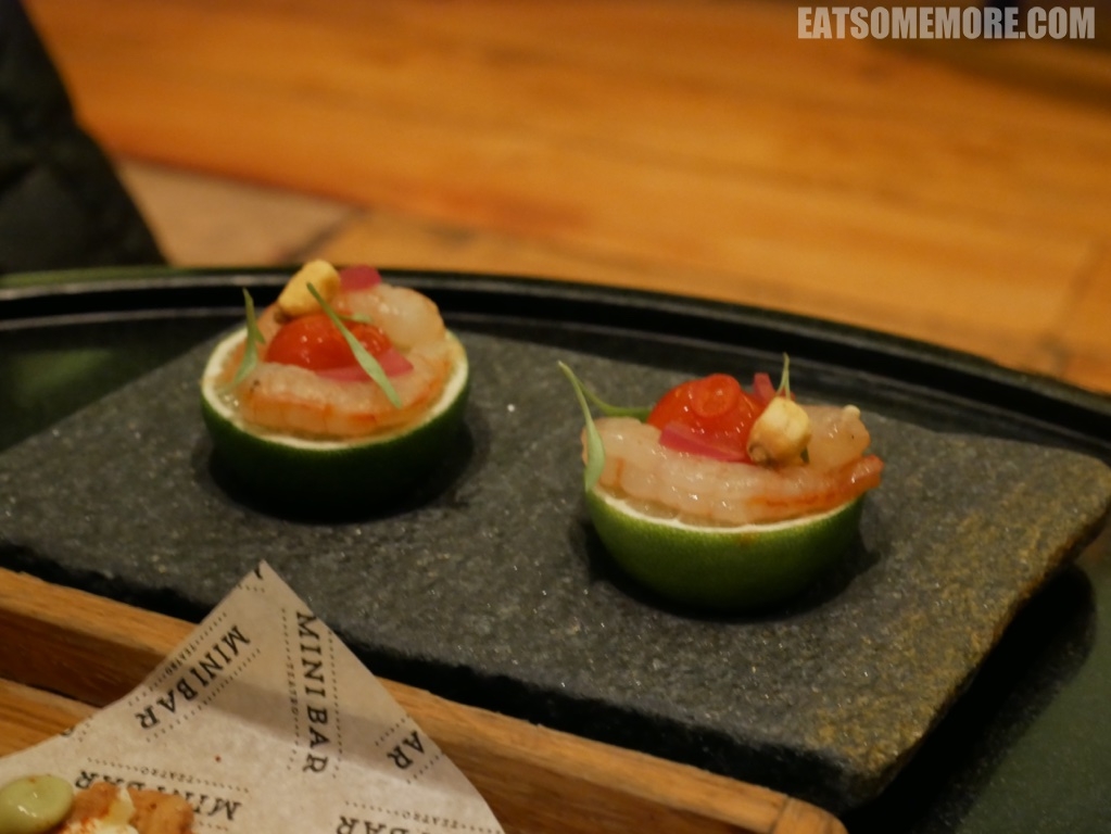 酸柑上工整地各摆了一只处理得非常干净的鲜虾刺生,鲜甜的滋味随着食材在口中的乳化变得越来越浓郁。