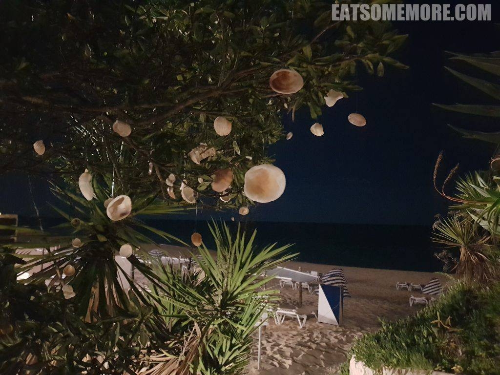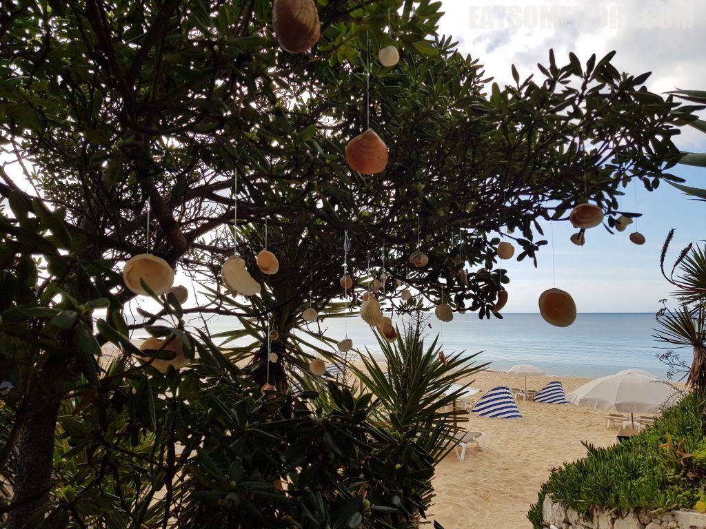 下了楼就是海滩,地理位置一流。树枝上用鱼线悬着贝壳,随着海风轻轻摇曳。