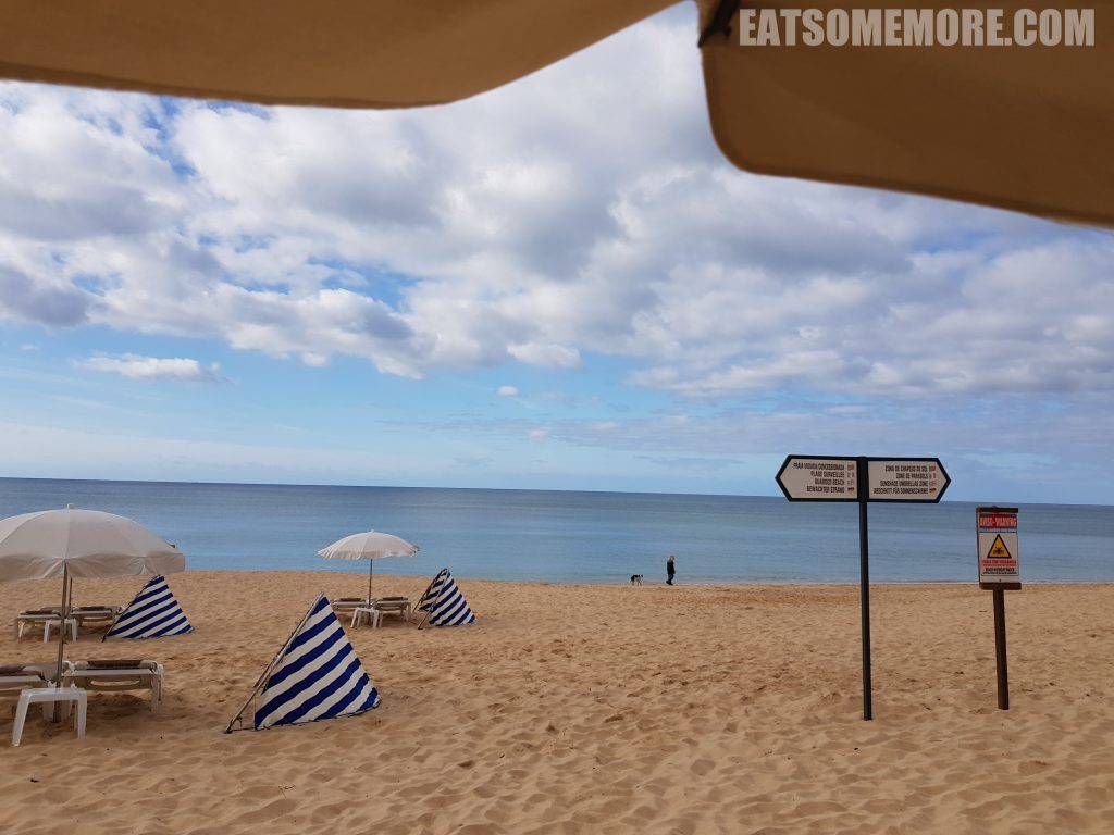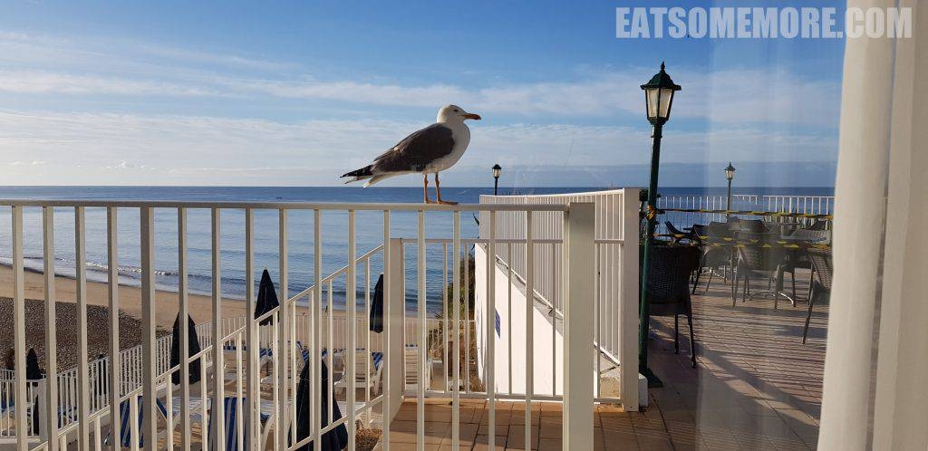 转眼在葡萄牙开始了新的一天。天亮后酒店的地理位置优势更加一览无遗。一片沙滩、两种颜色的海、三盏街灯、四朵阳伞、五把躺椅,还有来自本地居民——海鸥的殷切关注。