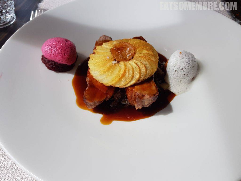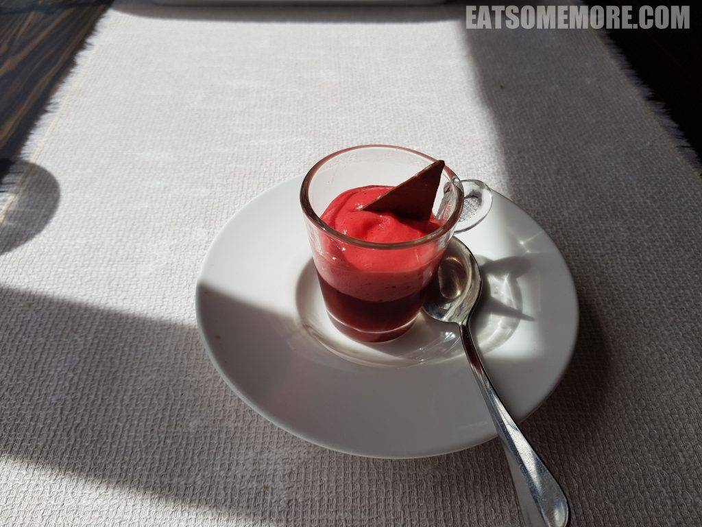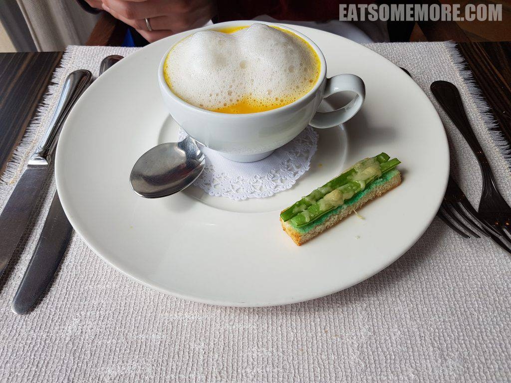 餐前小点是花菜浓汤配红菜头马卡龙。浓汤奶香馥郁,马卡龙没有红菜头的涩味,只留清甜。