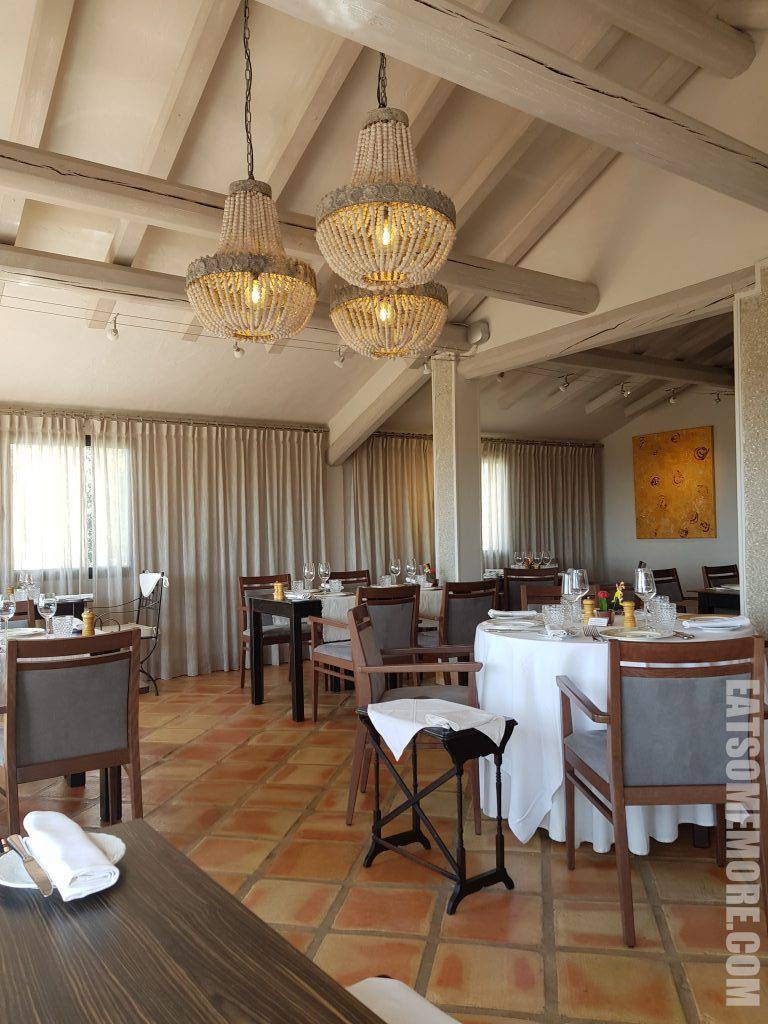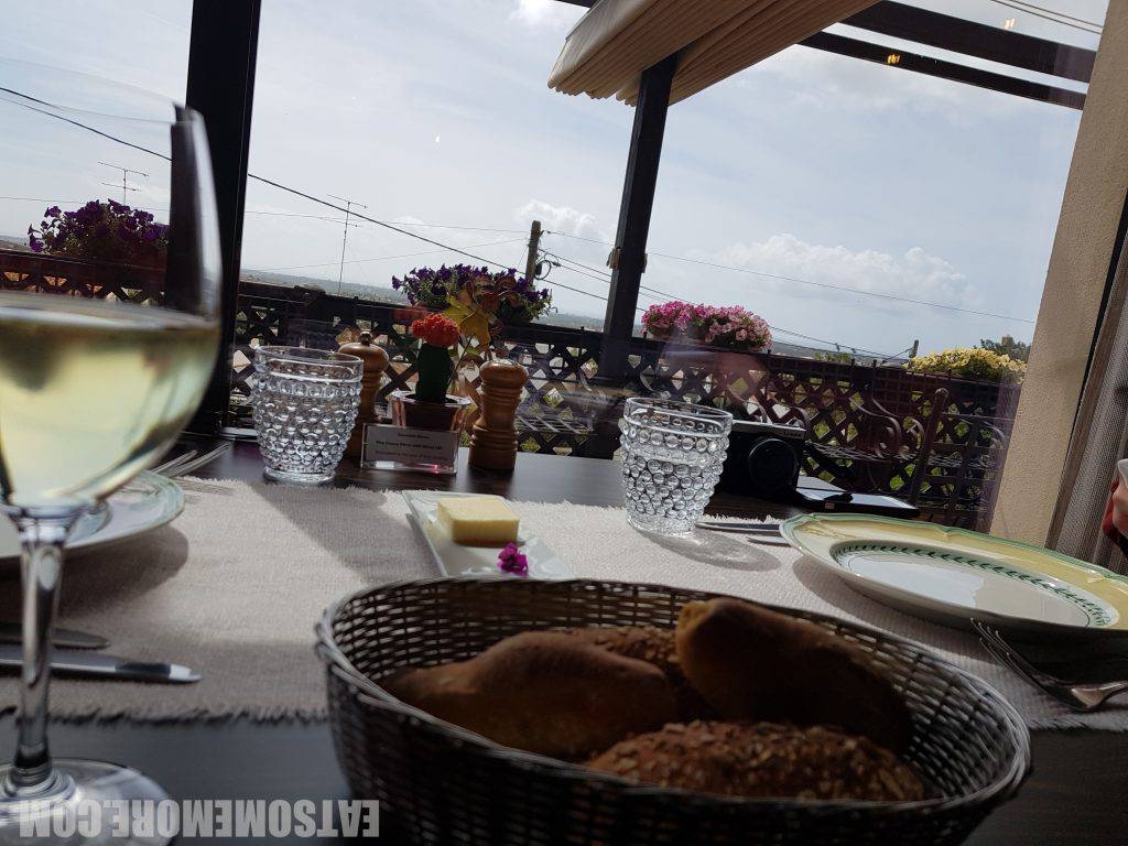 餐厅的阳台可以看见缓坡上的村落和远处的大海。