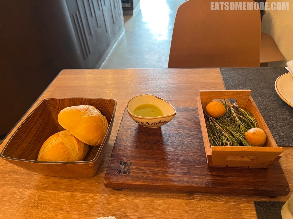 右手边迷迭香上放着的是两粒鲜甜柔韧还有点辣的黑布丁泡芙。左手边是餐包搭配橄榄油。
