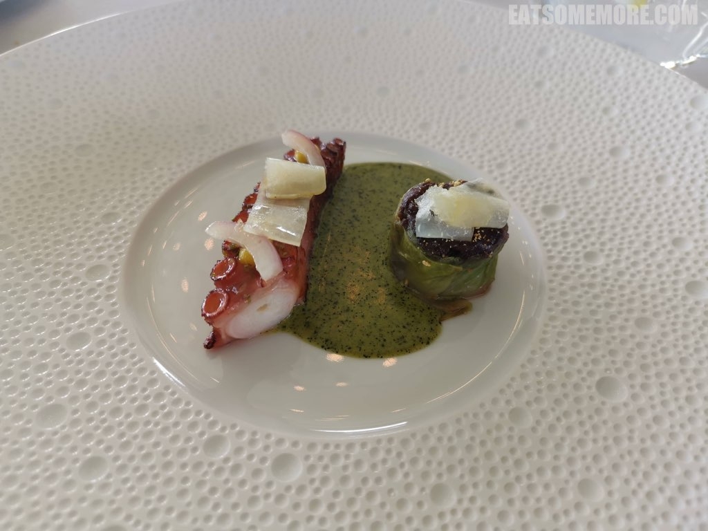 野生章鱼烤得酥软,吸盘的部位仍脆脆的,以少许橘子酱和蒜泥罗勒青酱调味,菊苣脆生清甜,紫甘蓝卷软烂入味。