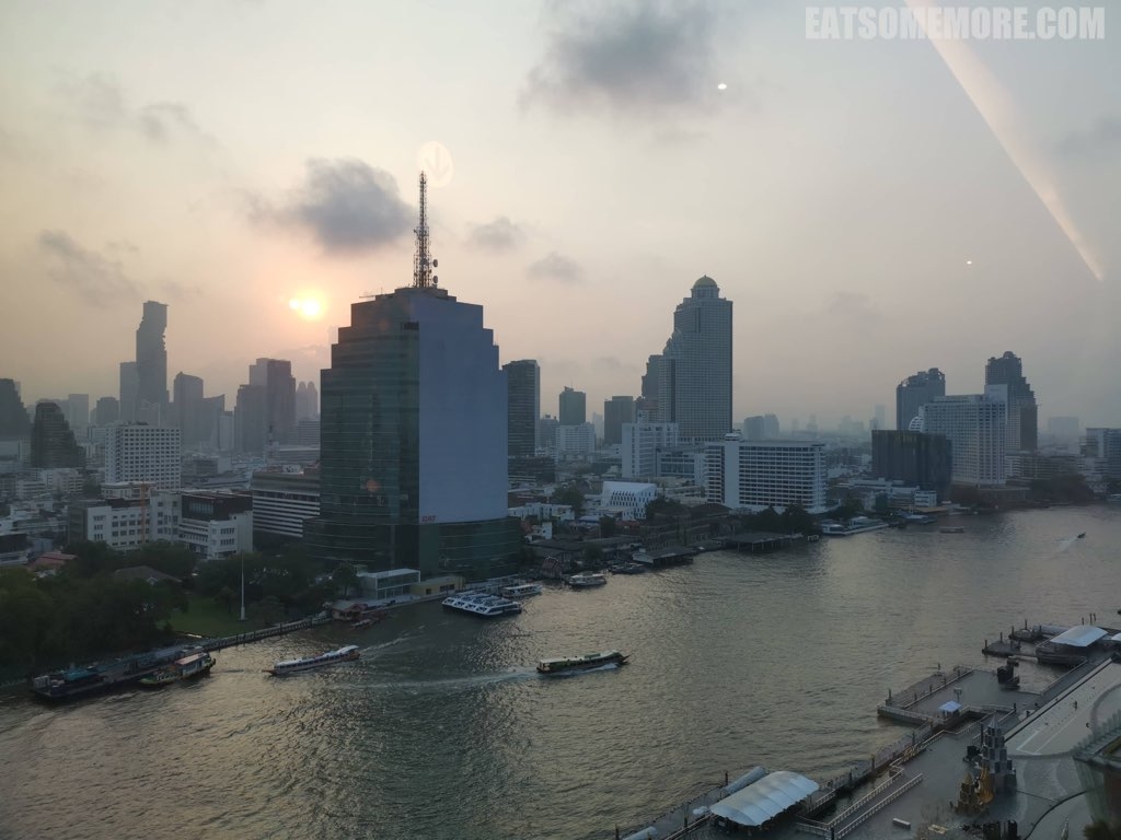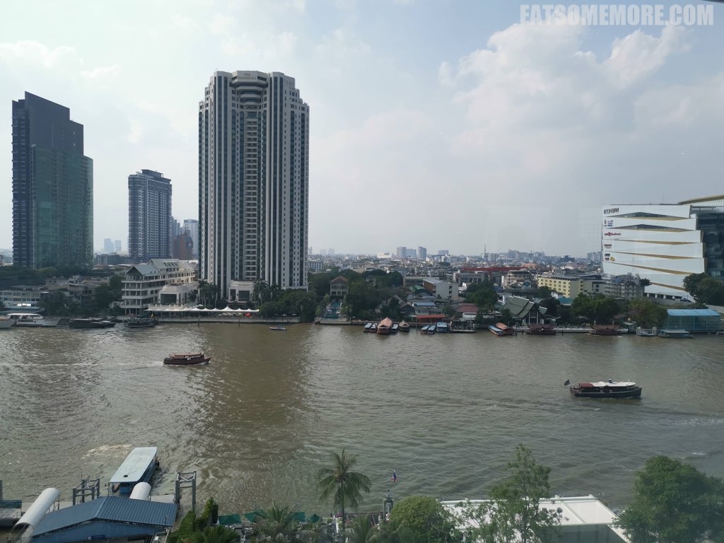 窗外是湄南河和西岸的半岛酒店、文华东方公寓和购物中心。