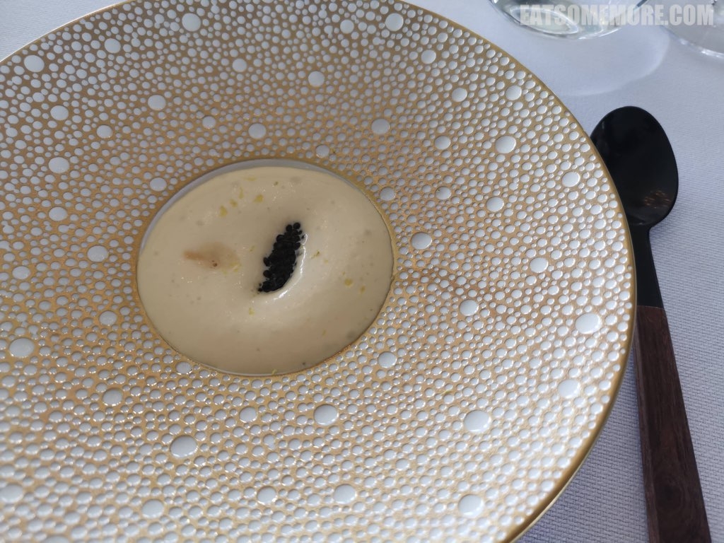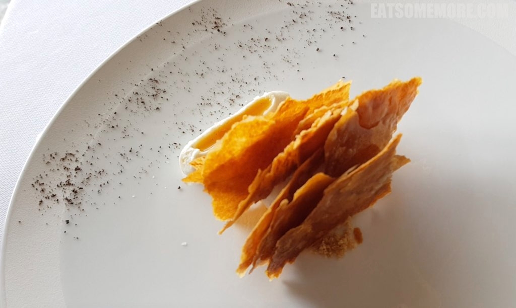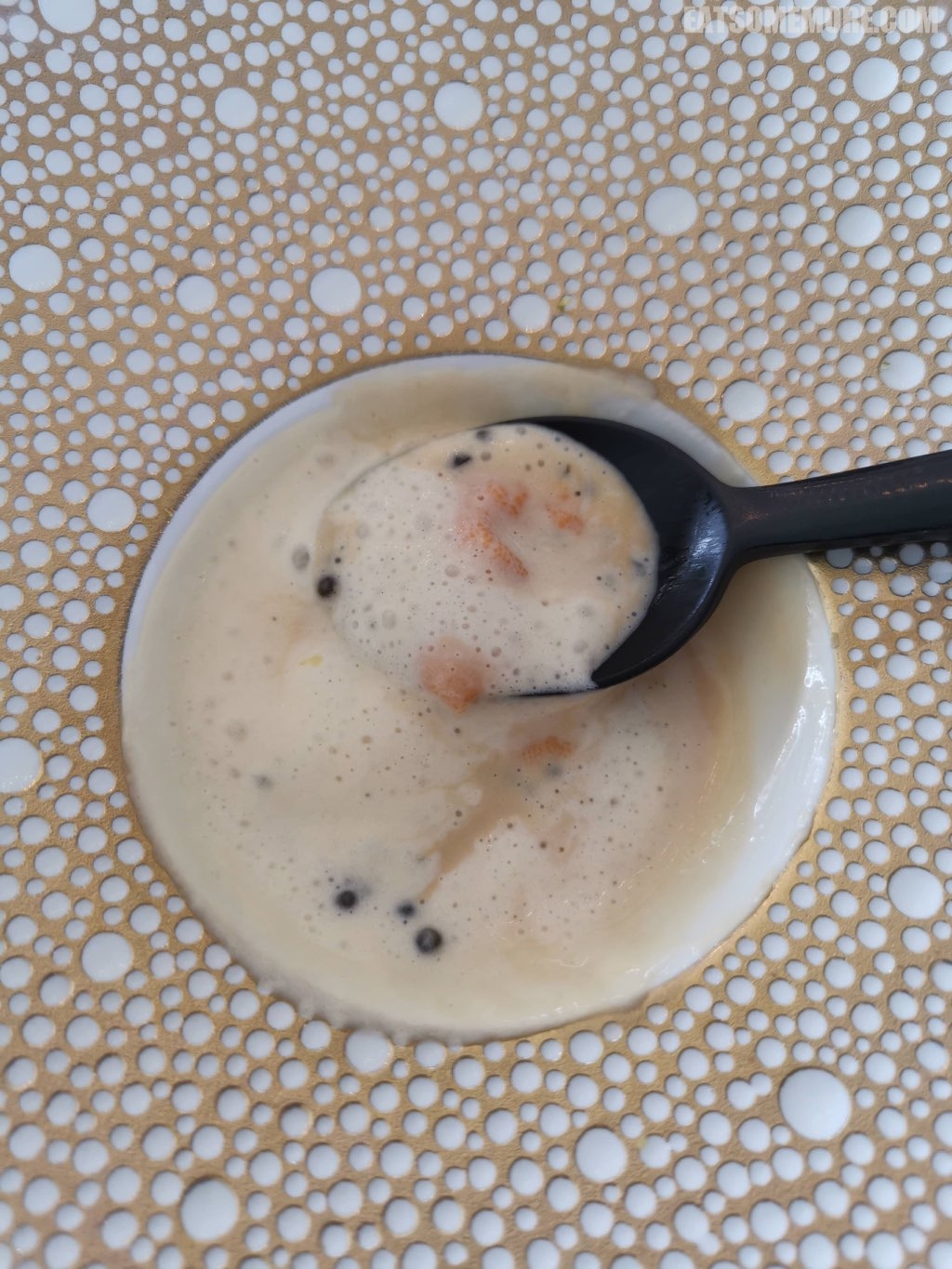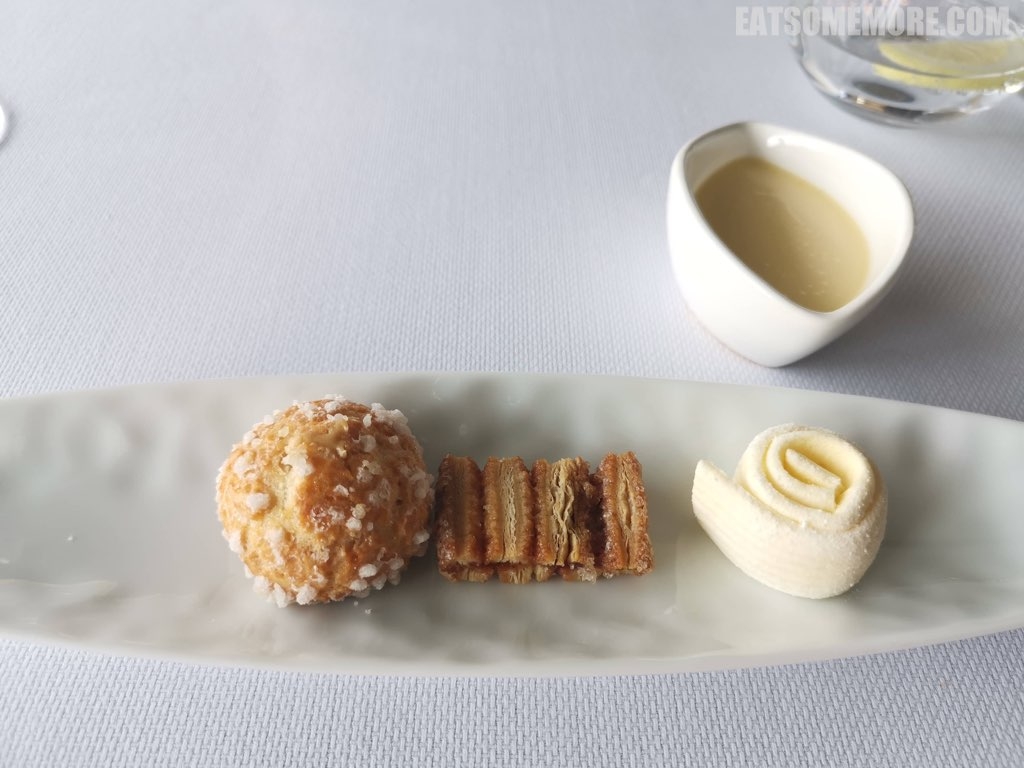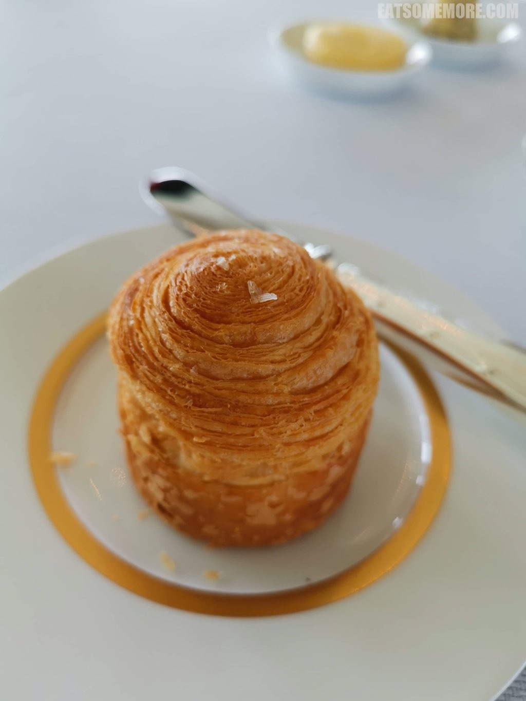 接着来到了选择黄油和面包的环节。选择多种多样:黄油有法国传统的,加海藻的,加盐的和什么都不加的;面包有餐包、起酥包、小法棍和酸种包。我选了起酥包搭配海藻黄油。起酥包本身就很好吃,虽然是冷的,但贵在酥皮层层复层层,包裹着湿润有弹性的香甜味道,配上有着隐约蚝味的海藻黄油,更提鲜香。