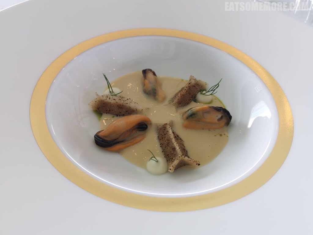 法国蓝青口煮得非常脆嫩。带着草本味的大头菜咖啡饺泡在青口酱当中,味道层次丰富。