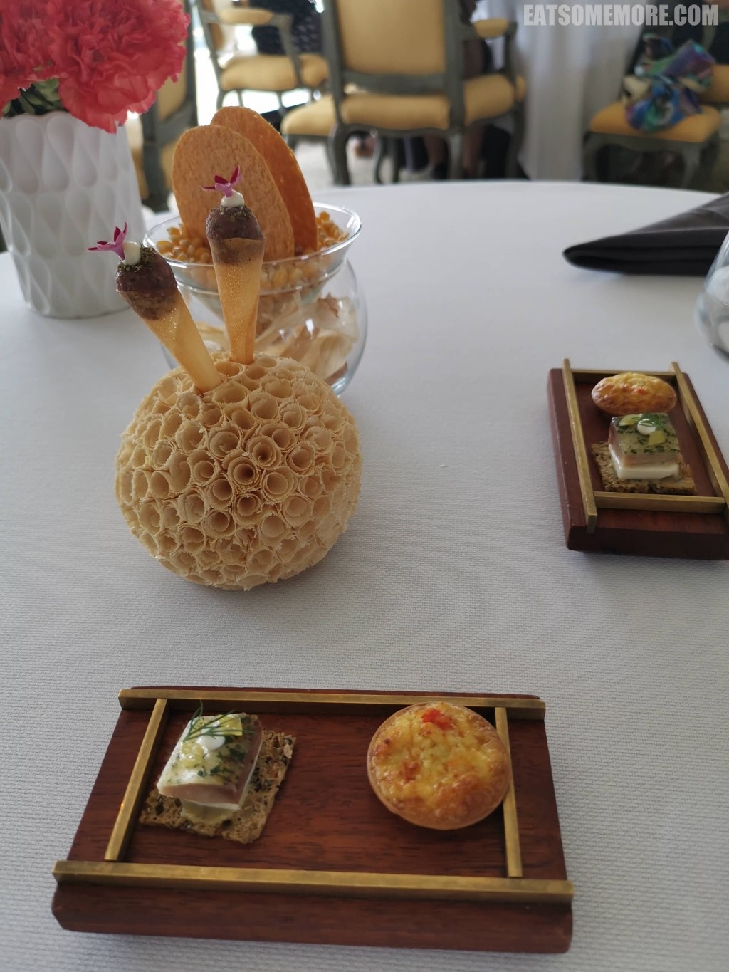 餐前小点心有三样。芝士脆饼薄而酥脆,鞑靼牛肉筒里生牛肉碎混合东南亚香料味迸发着鲜甜的肉汁,熟成鲭鱼缀以莳萝和柚子酱清新甘甜,蟹肉塔奶香浓郁。