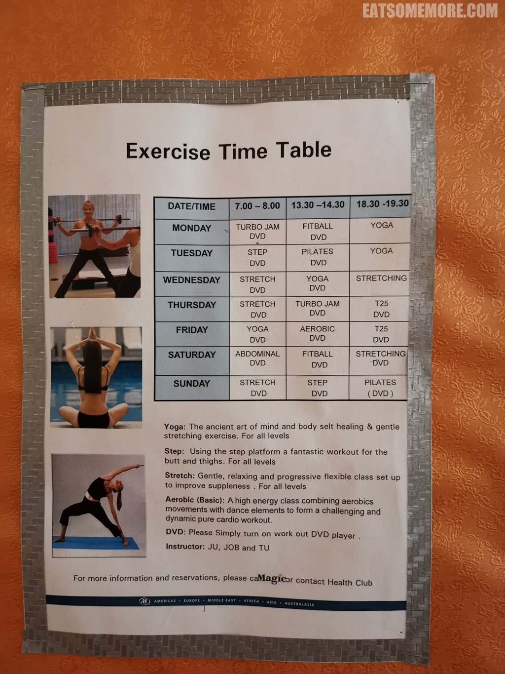 酒店健身中心提供各种课程,包括瑜伽和普拉提。经过了缜密的思量和考虑,我还是出门玩去吧!