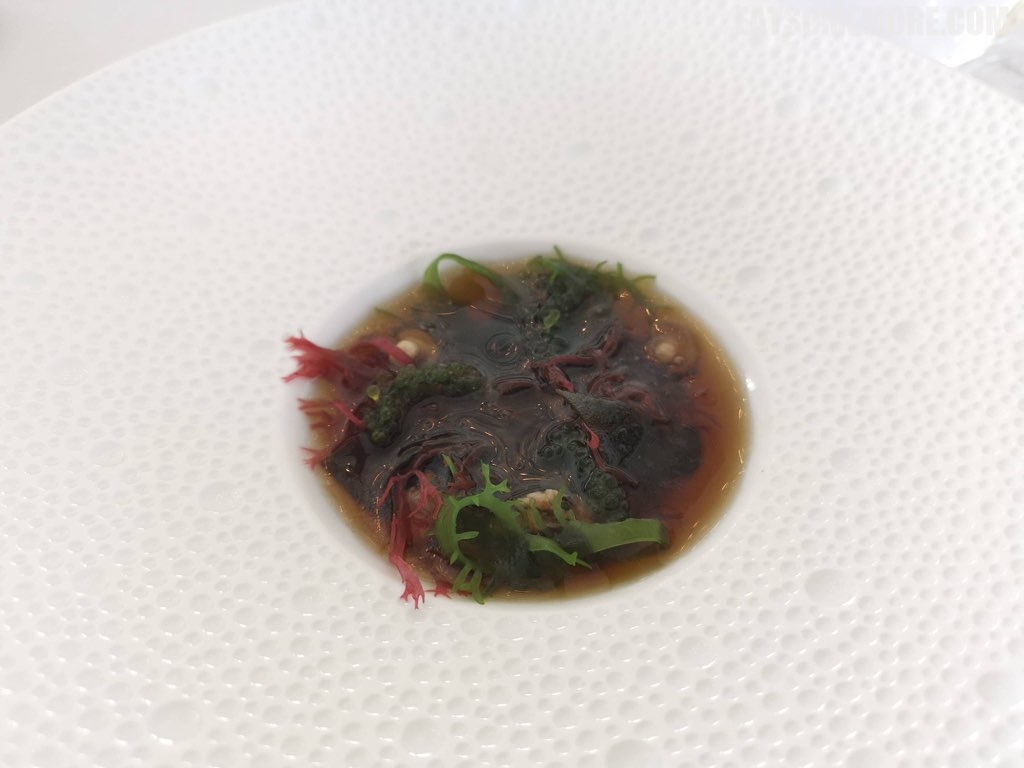 提取出来的汤汁被缓缓地注入盘子,泡着红色、绿色、棕色的海藻和蘑菇碎,尝起来口感脆,口味鲜。