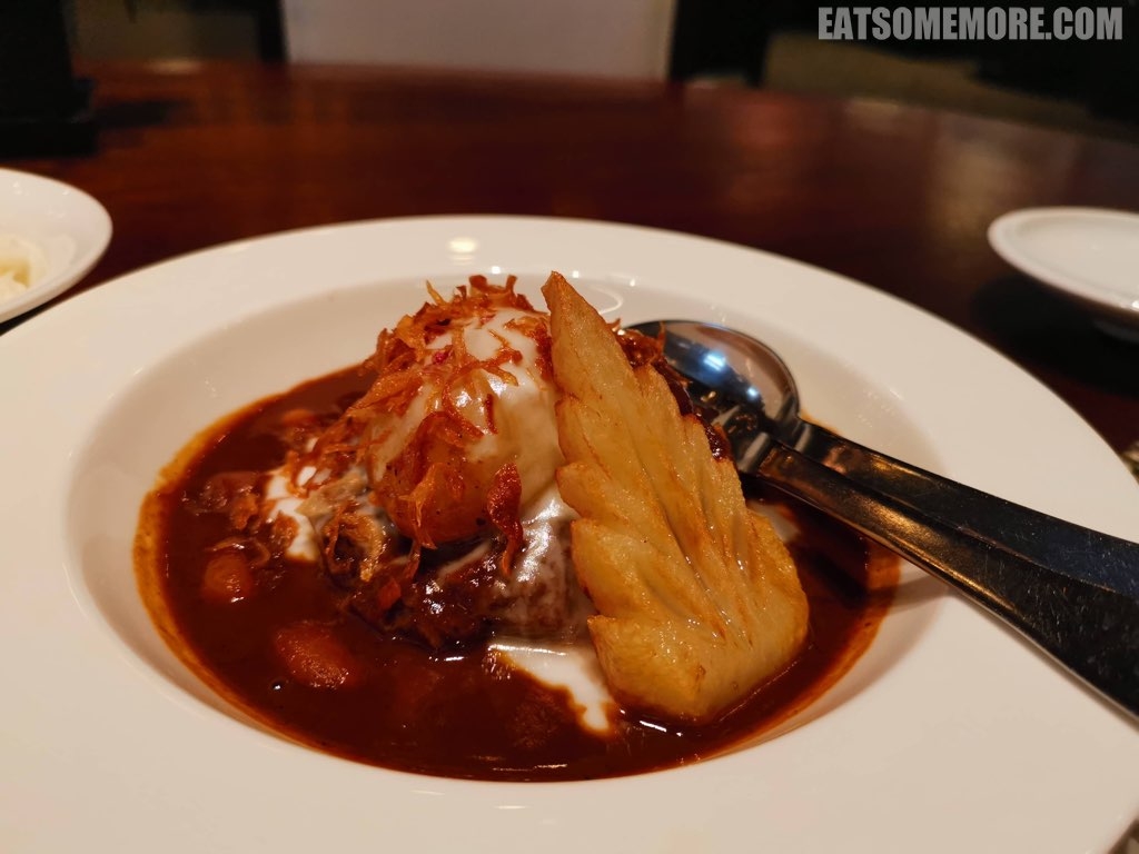 玛莎曼甘烹盛县牛肉咖喱,味道丰富浓郁,辣度较为温和,据说是泰国南部家常咖喱的代表。不查不知道,联合国粮食及农业组织还刊录过甘烹盛县牛肉相关的品质养牛论文。甘烹盛县位于泰国中部佛统府的西北部,所培育的牛有25%泰国本地牛血统,25%婆罗门牛血统和50%法国夏洛来牛血统。肉质软而不烂,弹而不韧,筋肉相间,香且多汁。这道牛肉咖喱非常值得推荐。