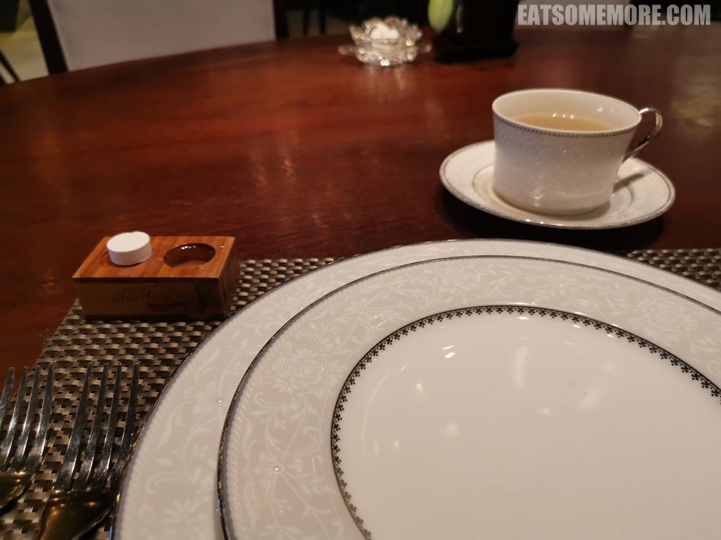 餐盘左前方的木盒有两个孔,一个放着压缩毛巾,另一个盛着柠檬香味的温水。将压缩毛巾放在水里,它就会膨胀成为一条湿巾。