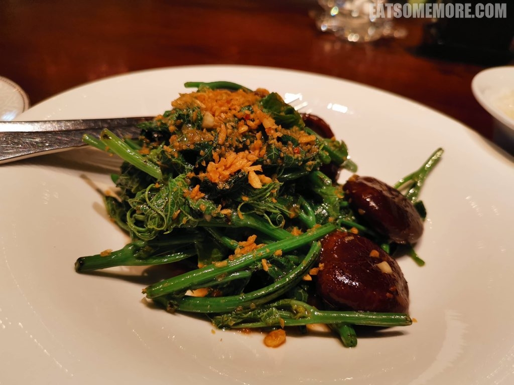 鲜香菇炒龙须菜,清新爽口。龙须菜,即佛手瓜的嫩茎,口感脆嫩。