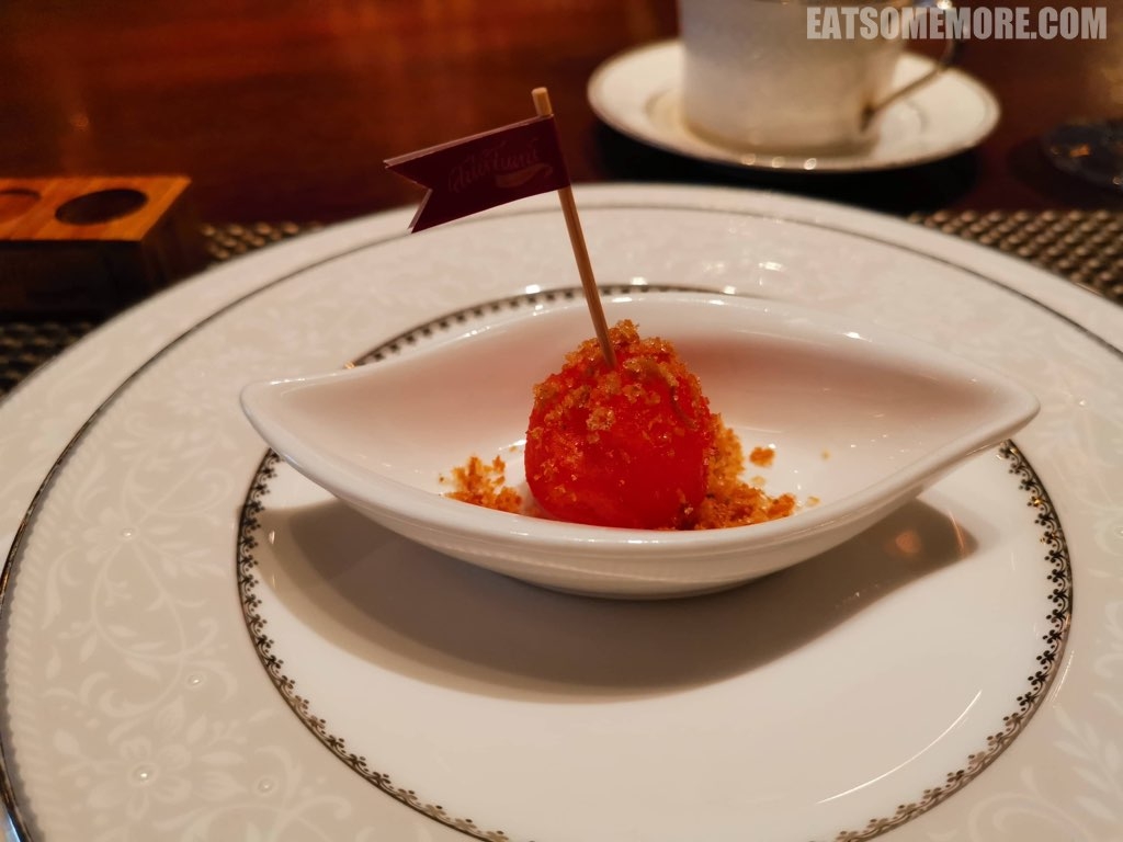 餐前小点是西瓜球裹着三文鱼松,果香和鱼鲜味的碰撞出人意表。