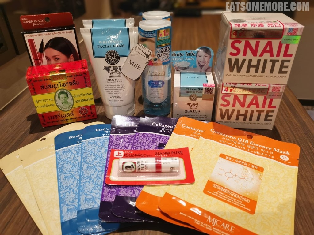这一篇的最后,想跟大家分享这天在药妆店的收获,包括泰国本土产品NAMU蜗牛美白面霜、Beauty Buffet牛奶Q10睡眠面膜、Beauty Buffet牛奶洗面奶、Mistine防水眼线液、阿婆牌草本香皂和上标薄荷油。另外顺手还购入了成分天然无添加的韩国MJCARE面膜和温和不刺激卸妆无残留的日本曼丹眼唇卸妆油。这些产品在网上好评如潮,但我还没有来得及全部打开来使用。如果大家对用后感感兴趣的话请给我留言,有机会的话再跟大家分享。