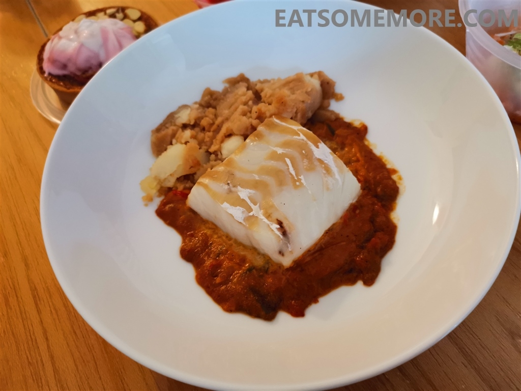 红椒酱烤鳕鱼搭配黄油土豆,我对鳕鱼的新鲜程度和调味的咸度有些困惑。