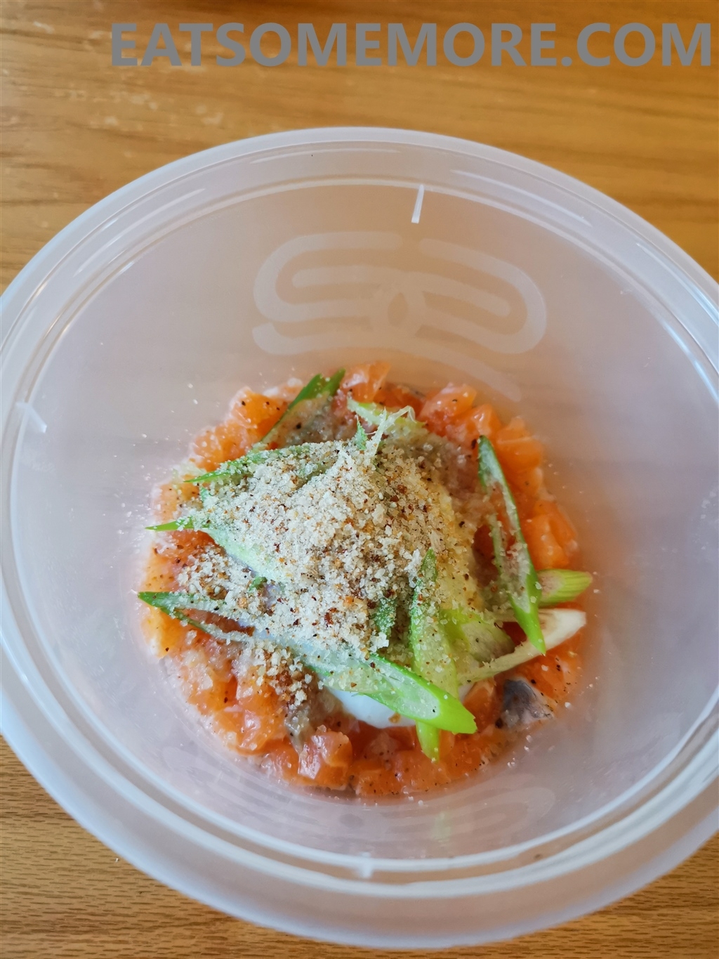 三文鱼塔塔中间有一颗煮到刚刚有些凝结的有机棕壳蛋,使得整体的味觉体验更加香滑,再撒上咸鲜的日式柴鱼粉,丰富了鲜味层次。