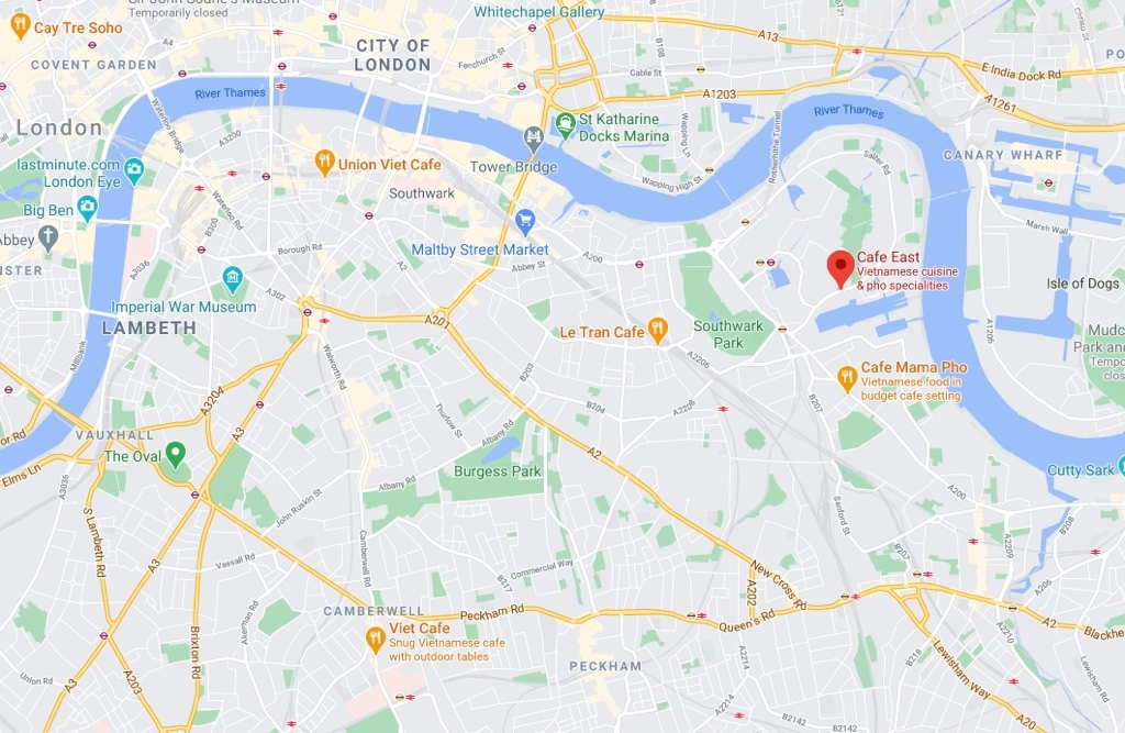 泰晤士河南岸的萨利码头地区,梧桐林立,砖房排屋,水晏河清。这附近的越南餐厅 Cafe East 一到饭点就大排长龙,非常地受欢迎。