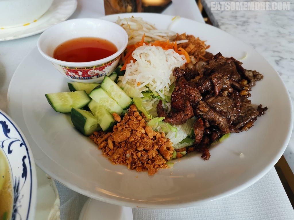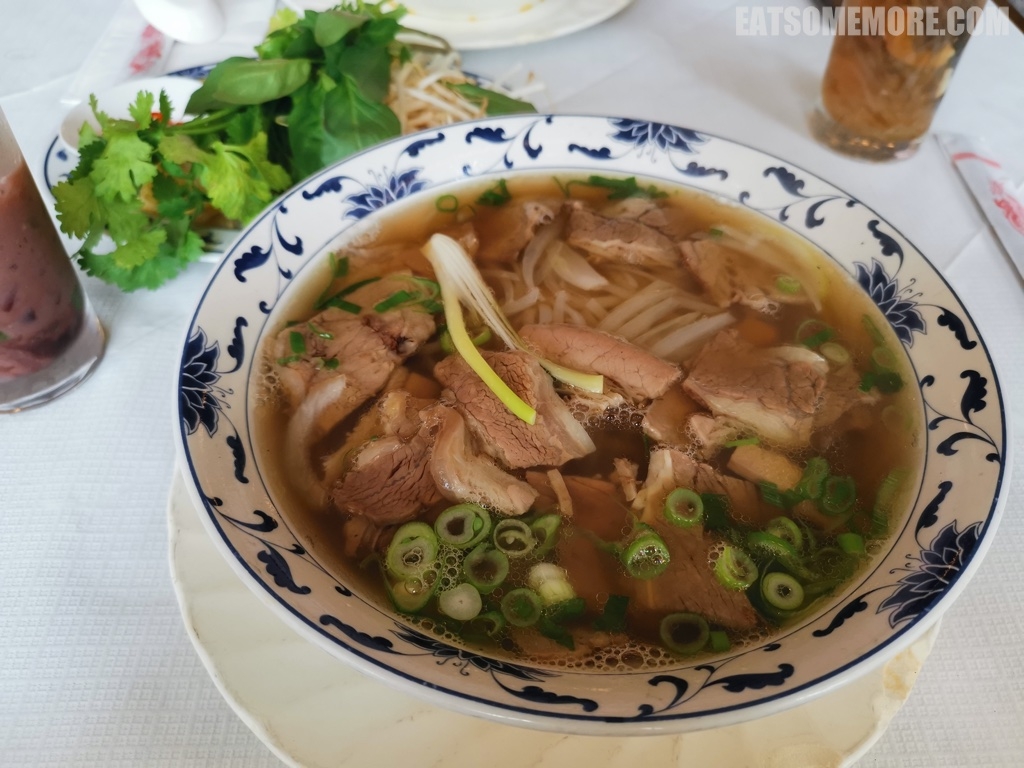我每次的必点菜品就是炖牛肉河粉,炖得酥软肥瘦相间的牛肉篇和宽粉浸泡在看似清澈、实则味道浓郁的高汤当中。趁着河粉刚刚上桌,尝了汤头后就得赶紧往里面加香菜、豆芽、柠檬草和青柠汁,让味道变得更加清爽鲜甜。