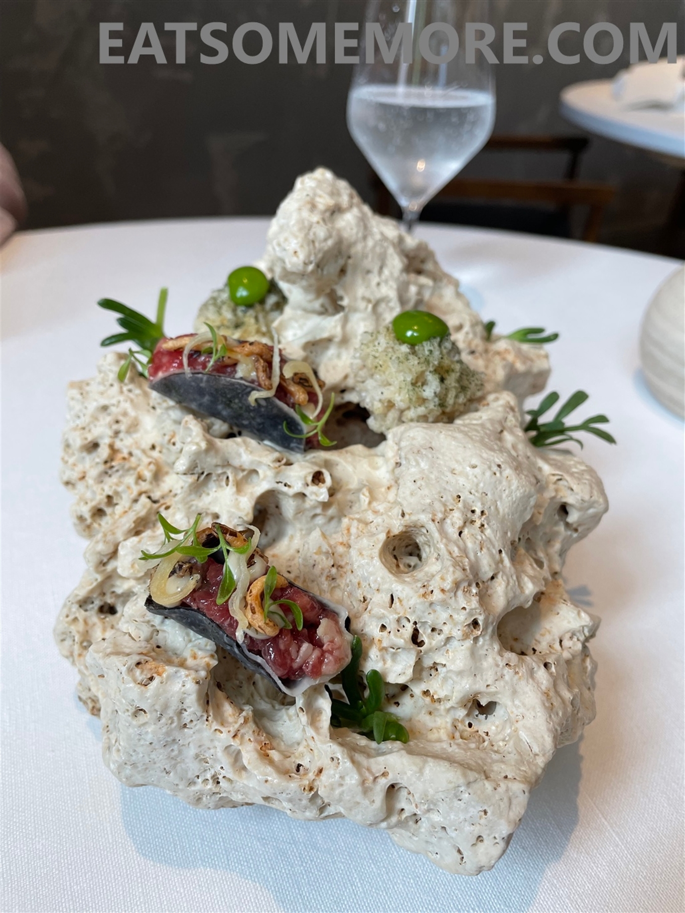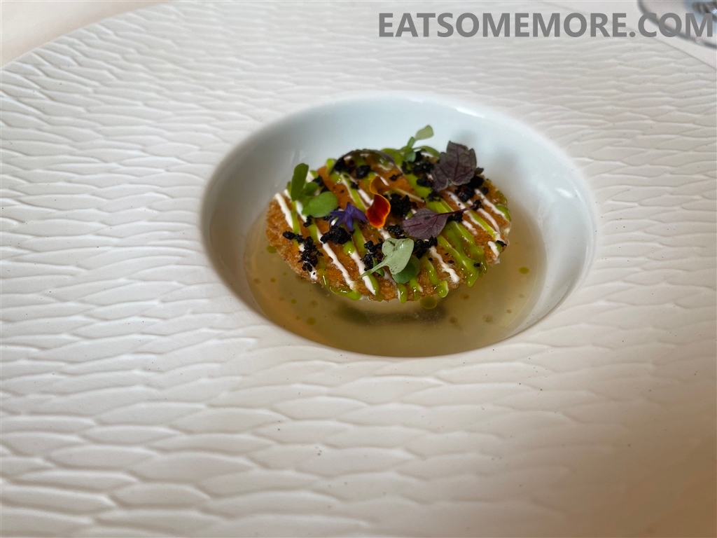 礁石上的两样餐前小点中,血肠塔可包裹着鲜香的熟成牛肉塔塔和酥脆的炸米粒;锅巴土豆丸子的外皮是带有海苔香味的酥脆锅巴,内馅是软糯咸香的土豆泥。