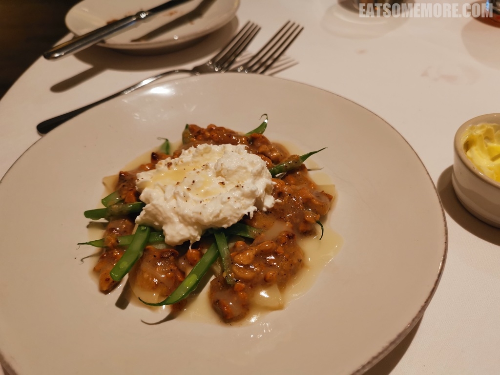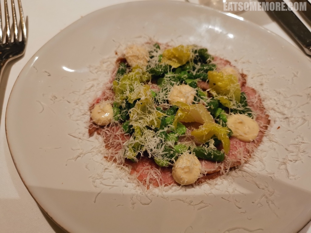 薄切烤小牛肉鲜嫩而有嚼头,浅浅焯过的季夏四季豆和小青豆与生菜嫩芽一起为这道菜添加了脆嫩爽口的口感,再以榛子酱和现磨芝士粉调味,满口鲜香。